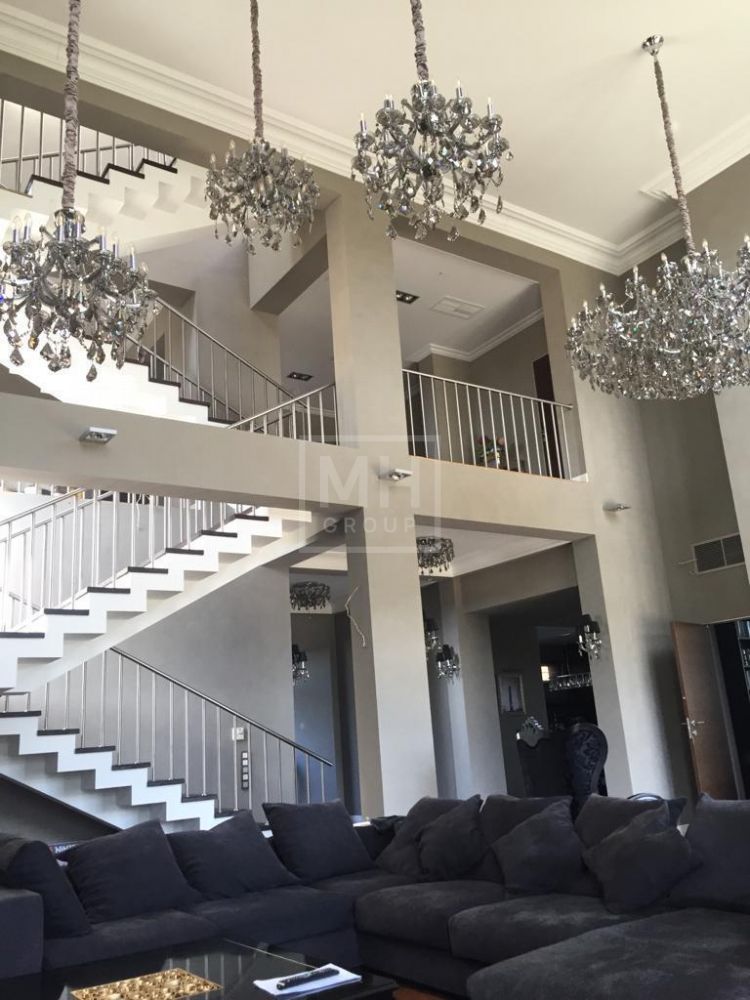 Этаж 1: гостиная со вторым светом (высота 8 метров), кухня (50)+столовая, кабинет, гостевой с\узел, комната персонала+с\узел, прачечная, гараж на 2 машины