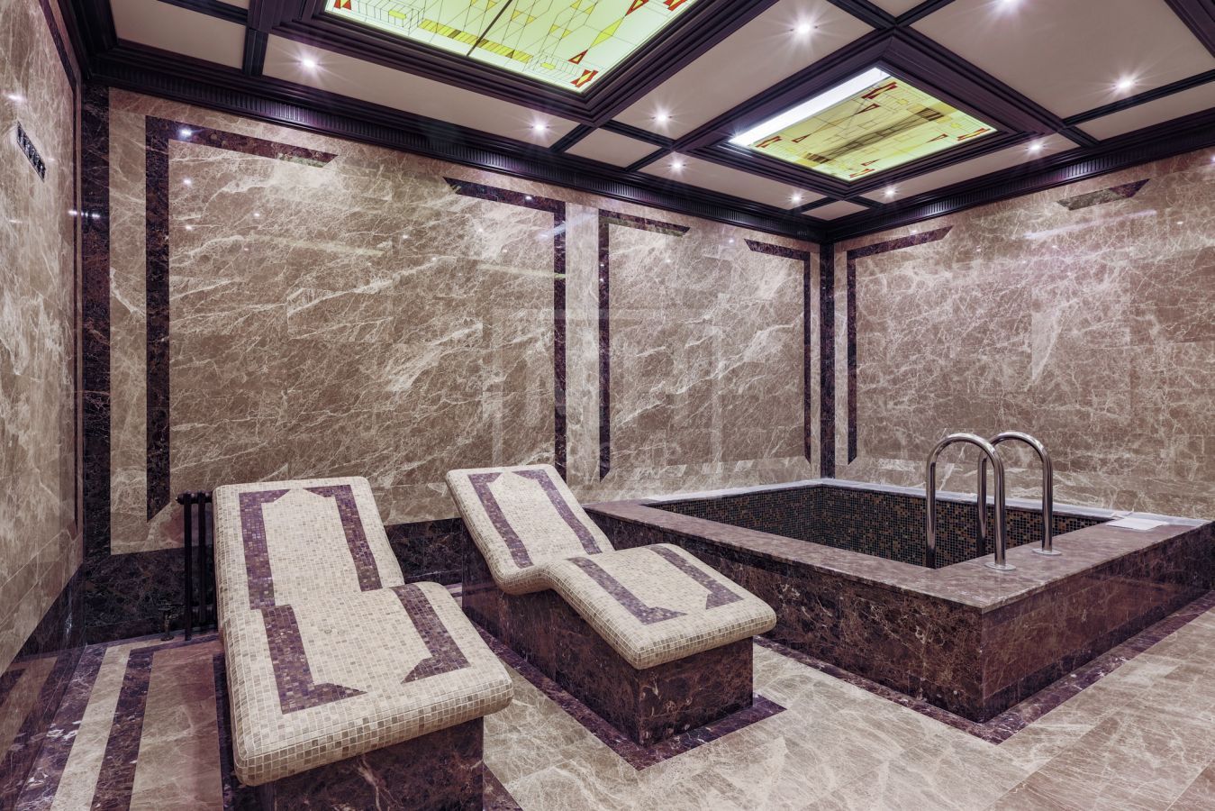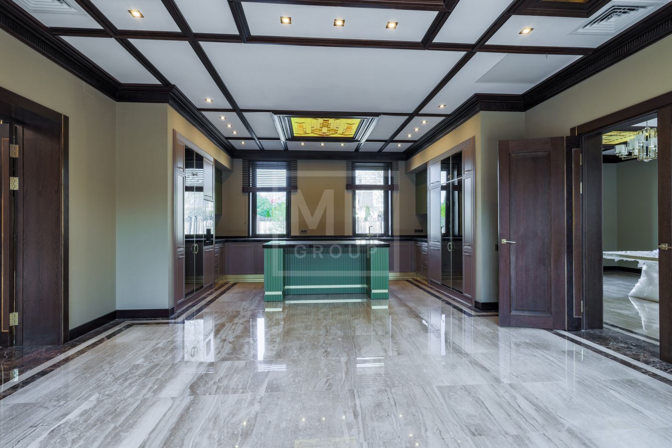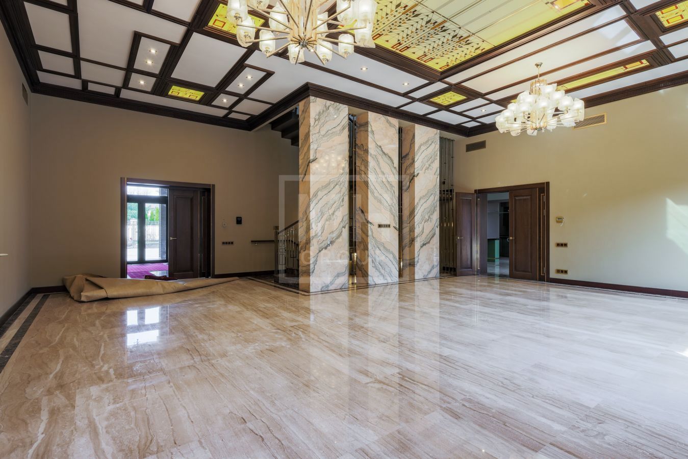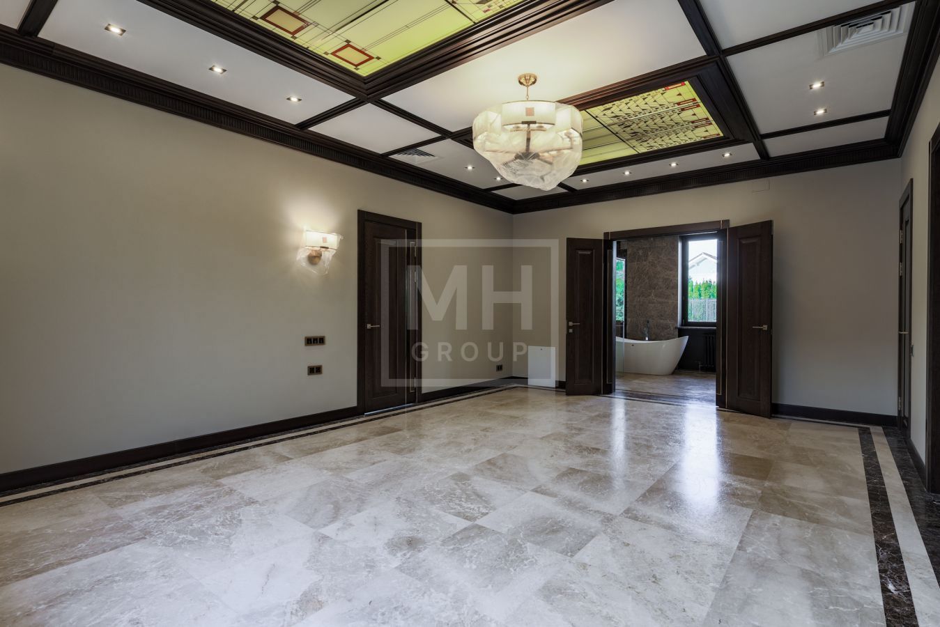 Этаж 1: прихожая, с/у, гардеробная, гостиная с камином, кухня, столовая, выход на террасу с джакузи и зоной барбекю, библиотека, гостевая спальня с с/у и гостиной, переход в спа-зону: комната отдыха, с/у, бассейн (15х6м), выход на террасу, сауна, хамам, купель;