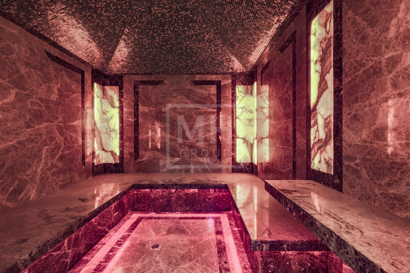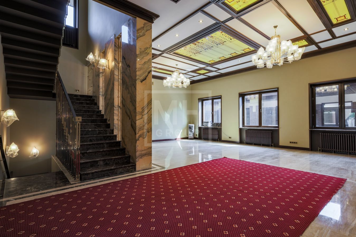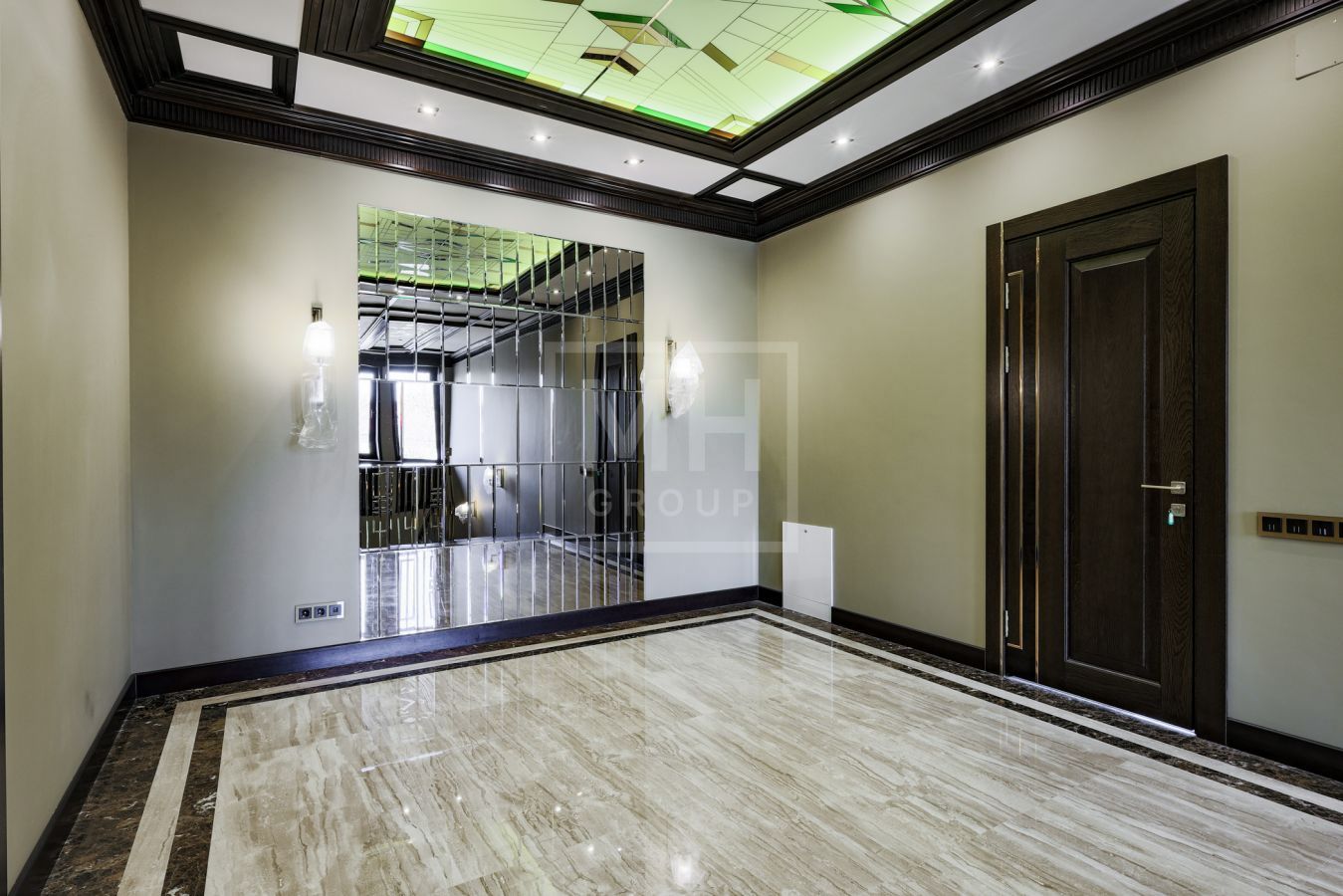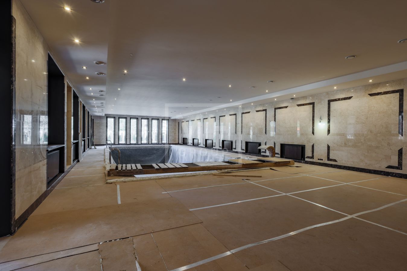 Этаж 1: прихожая, с/у, гардеробная, гостиная с камином, кухня, столовая, выход на террасу с джакузи и зоной барбекю, библиотека, гостевая спальня с с/у и гостиной, переход в спа-зону: комната отдыха, с/у, бассейн (15х6м), выход на террасу, сауна, хамам, купель;