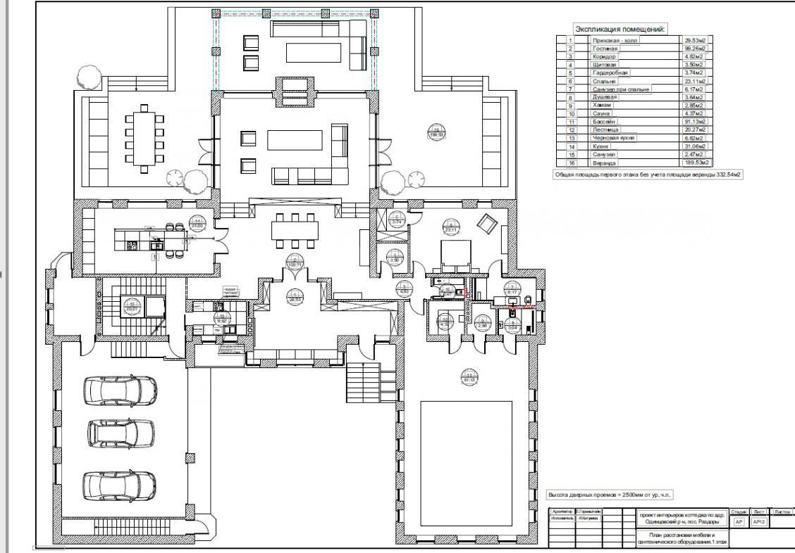 Этаж 1: Прихожая-холл, Гостиная, коридор, гардеробная, спальня со своим санузлом, отдельно душевая, хамам сауна, бассейн, лестница, Кухня, рабочая кухня, санузел, веранда около 200 метров, гараж на 3 автомобиля, над гаражом квартира для персонала( полноценная с 2-мя спальнями, гостиной-кухней, ванной комнатой, и гардеробной.