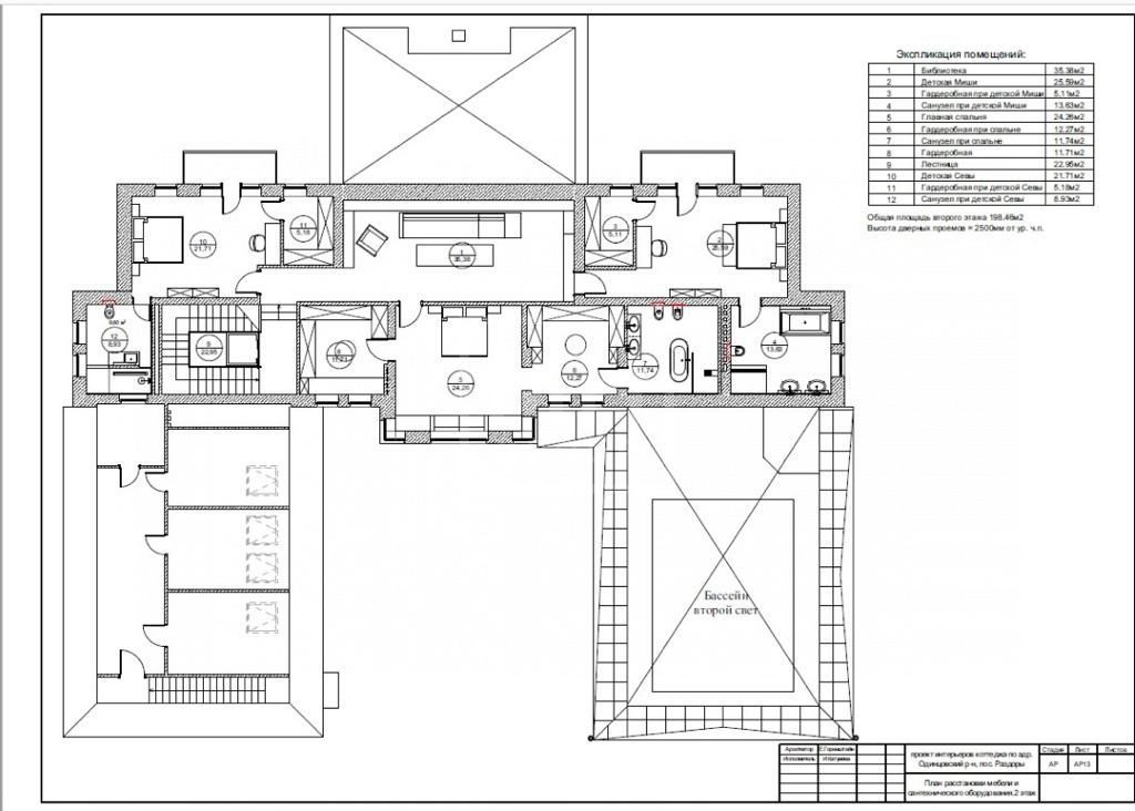 Этаж 2: Библиотека, Мастер спальня с двумя гардеробными и ванной комнатой, две детские спальни, каждая со своей гардеробной комнатой и ванной комнатой.