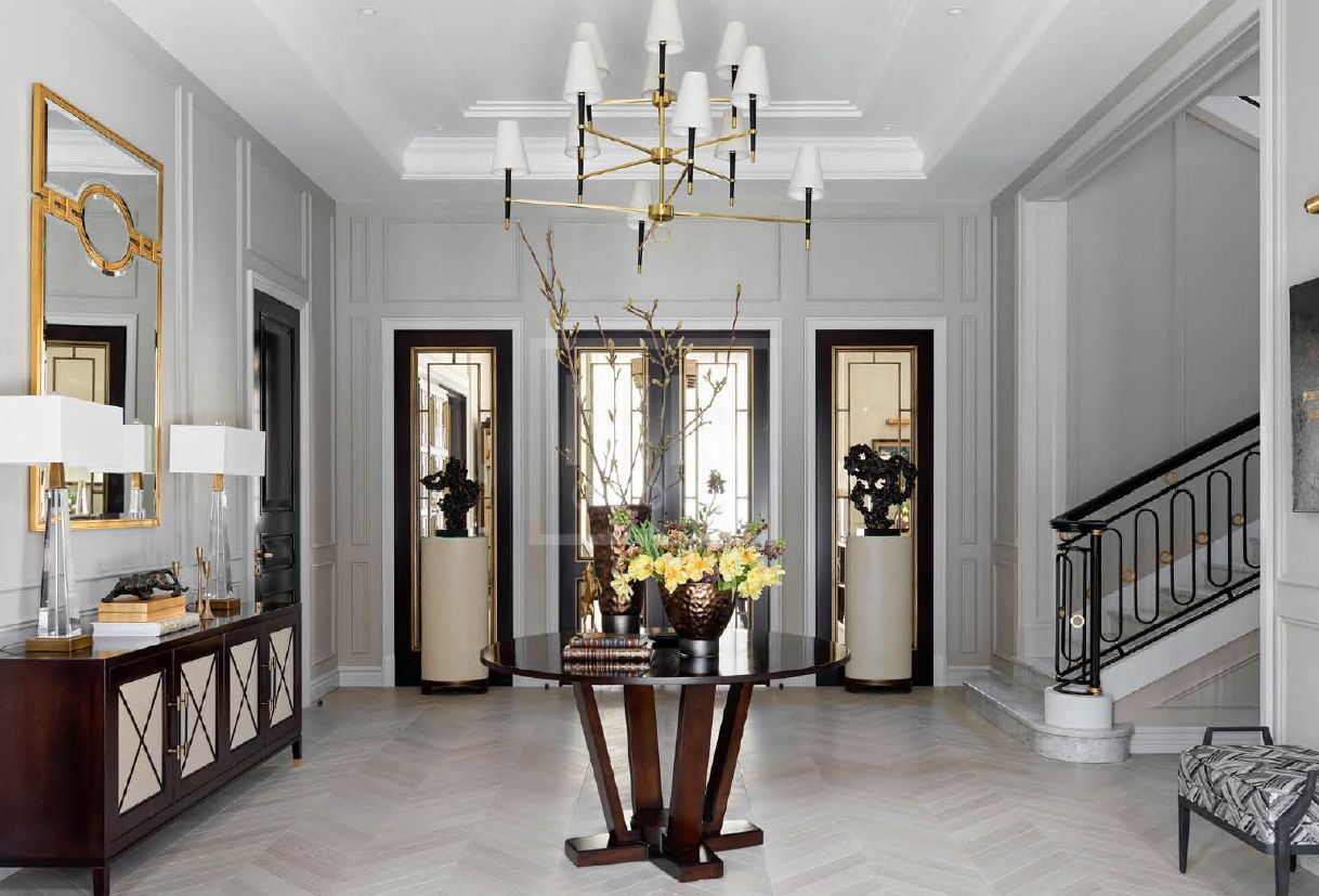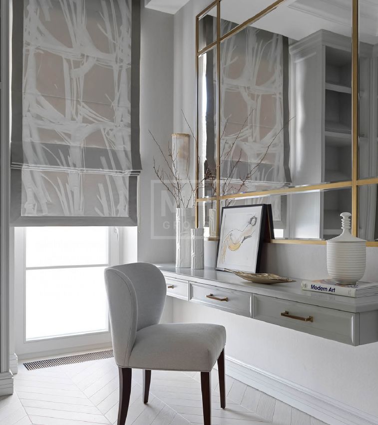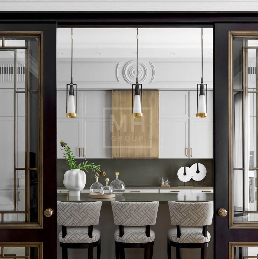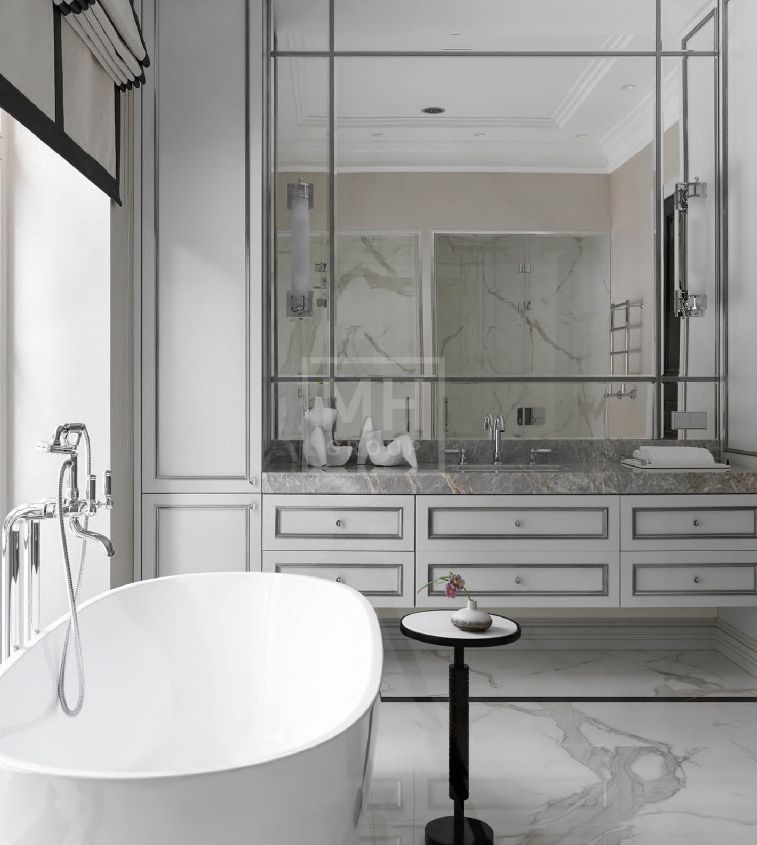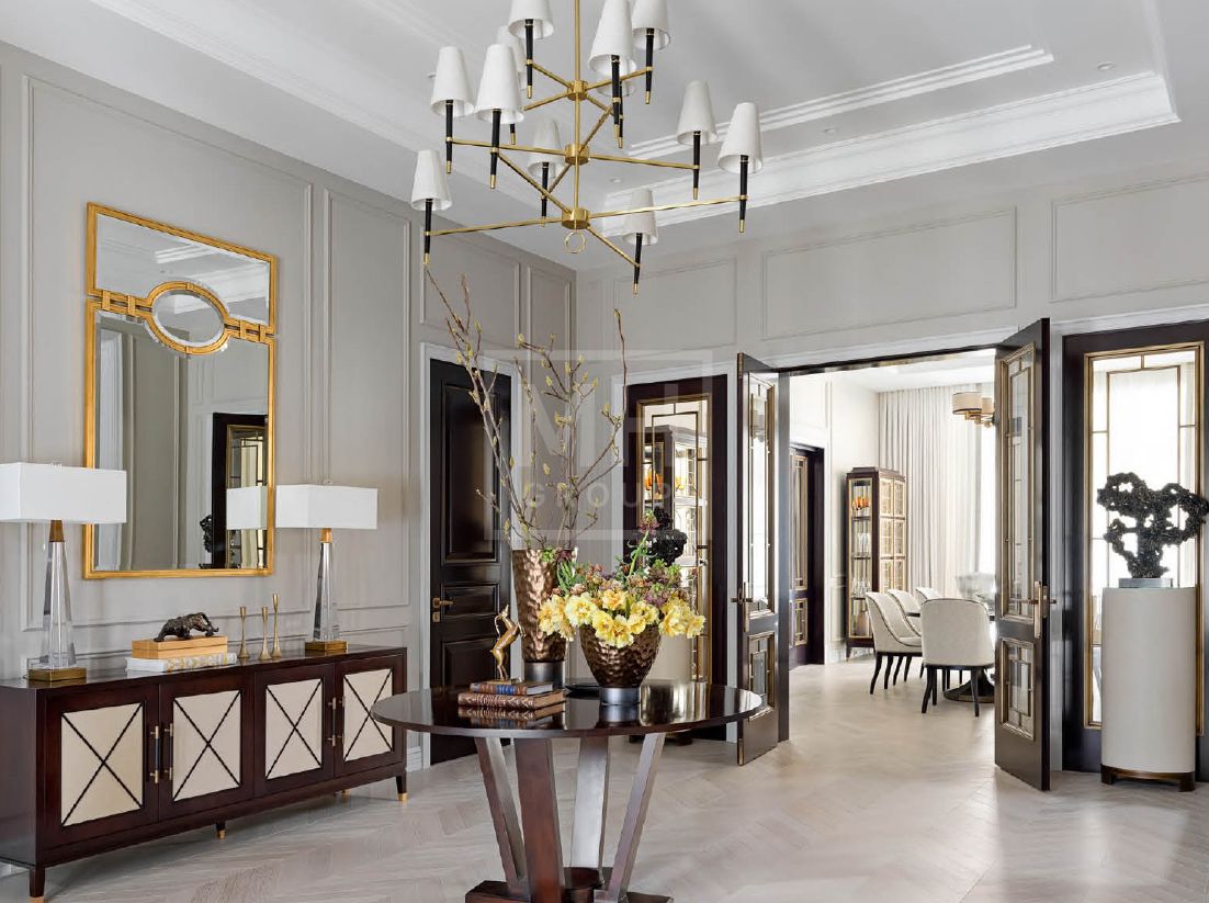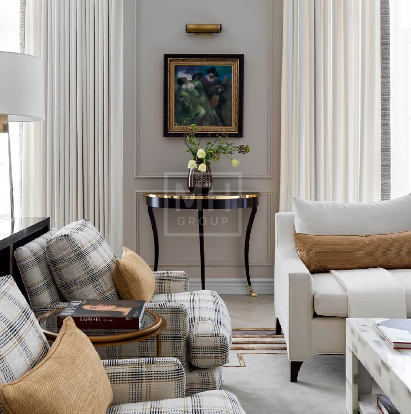 итальянский керамогранит, мрамор, инженерная доска из дуба, английская краска, дизайнерские обои, итальянская и немецкая сантехника, немецкая кухня из массива с техникой Miele и Liebherr.
