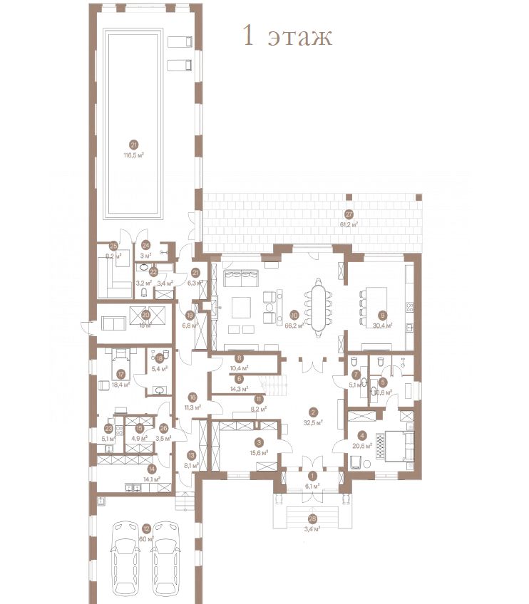 Этаж 1: Прихожая, гардеробная, с/у, спальня с с/у, кухня, столовая, гостиная, спа-зона с бассейном, раздевалкой, с/у, сауной, зона для персонала с кухней, спальней и с/у, котельная, гараж