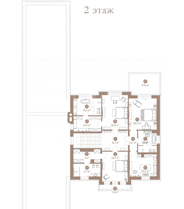 Этаж 2: Мастер-спальня с с/у и гардеробной, 2 спальни с с/у и гардеробными