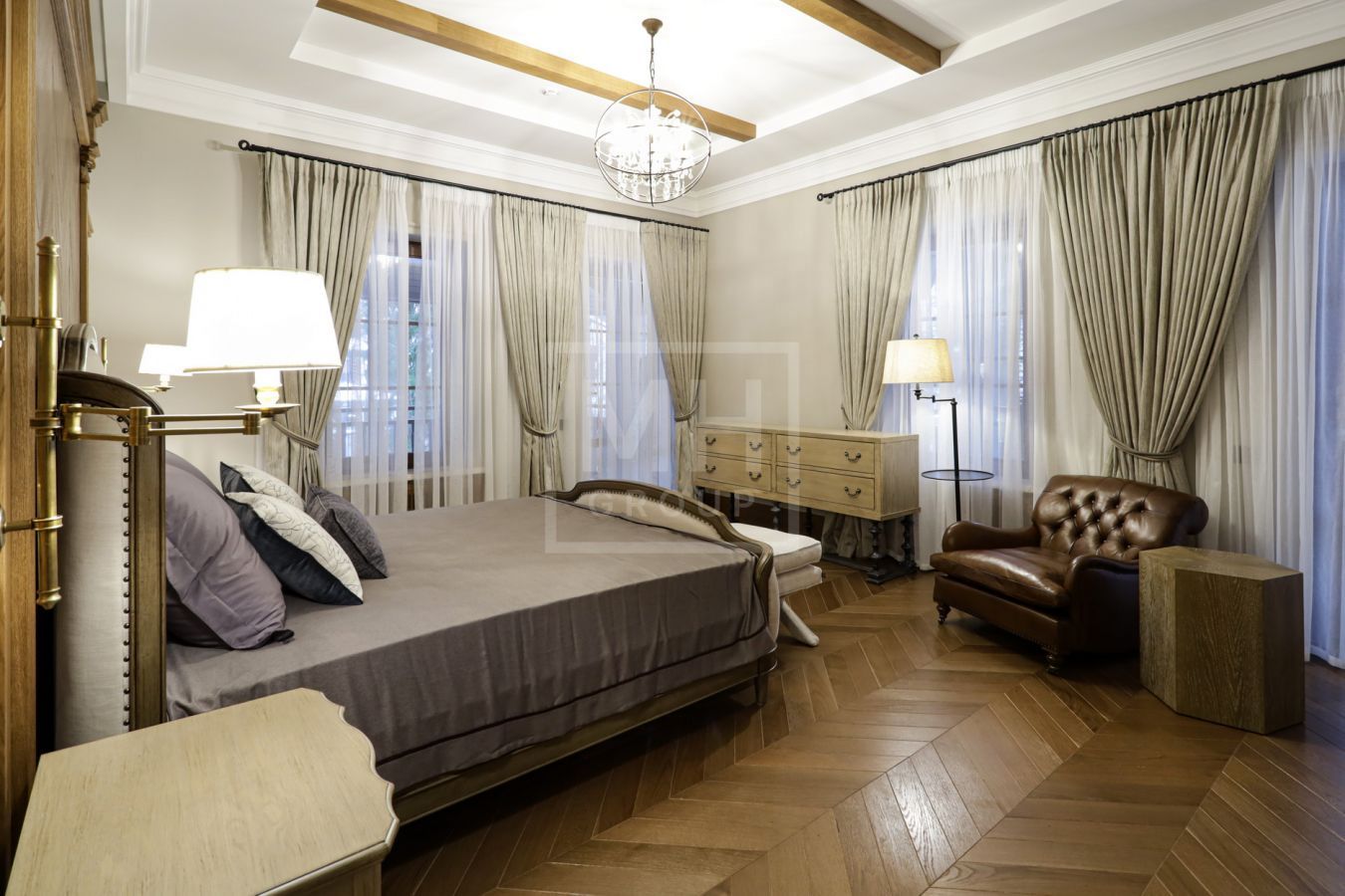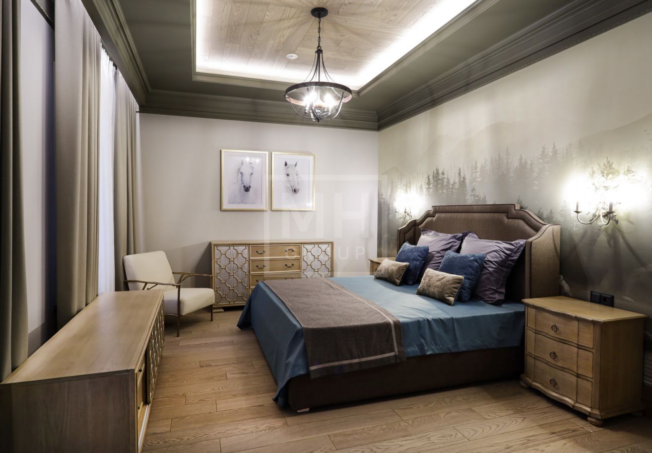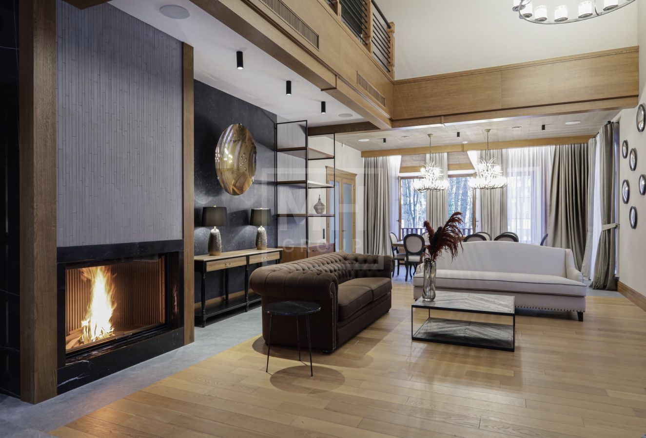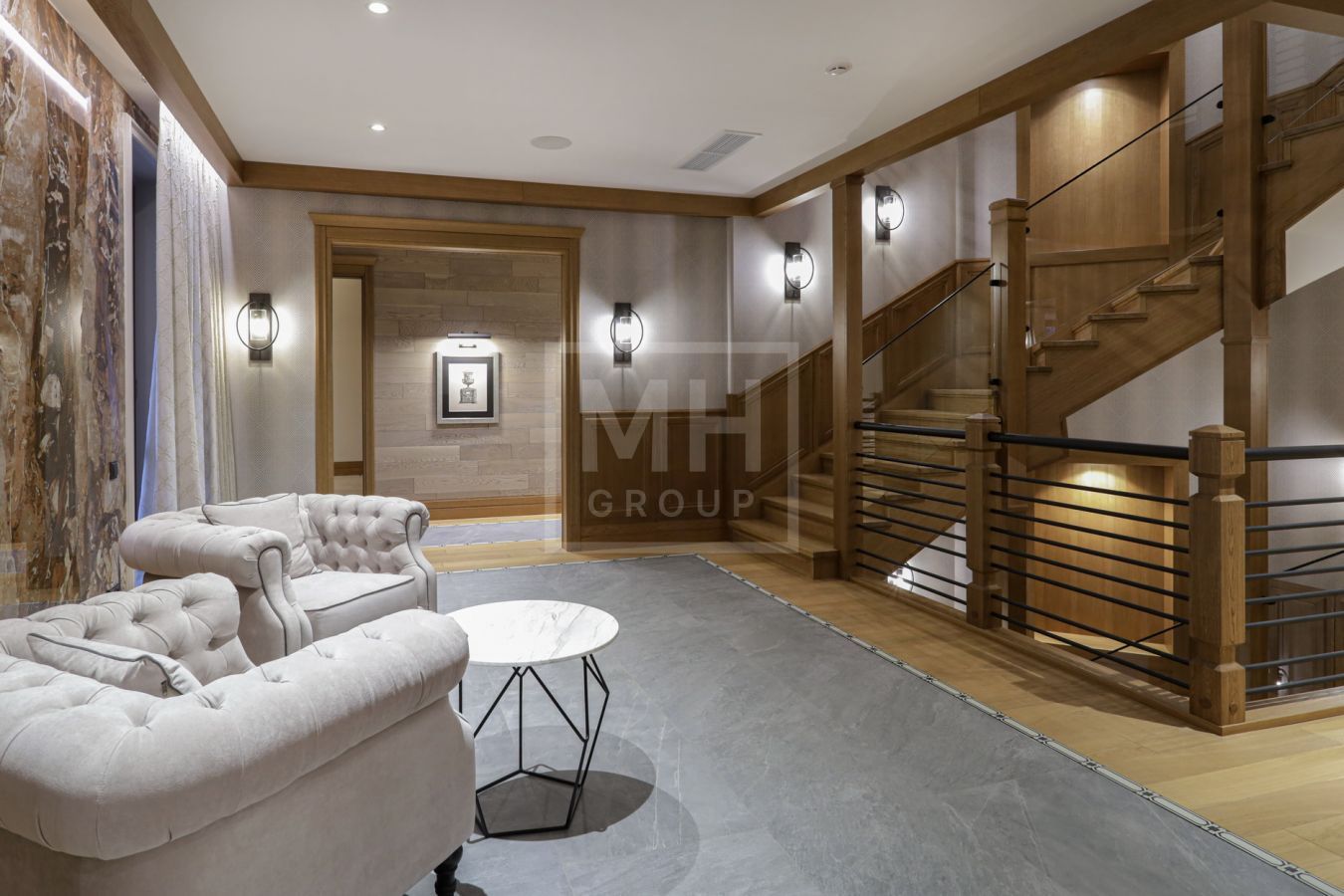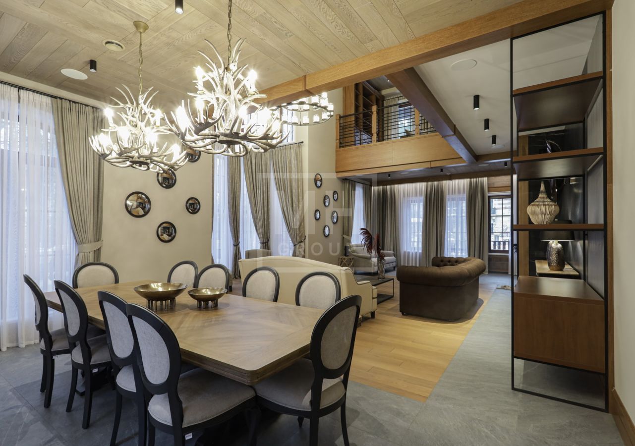 Дом с индивидуальным дизайнерским решением. Преобладает эклектика, объединяет пространства дома деревянные элементы из натурального дуба: панели, балки, лестница и т.д. Приятная и спокойная цветовая гамма создает состояние уюта.