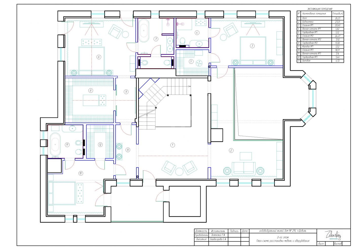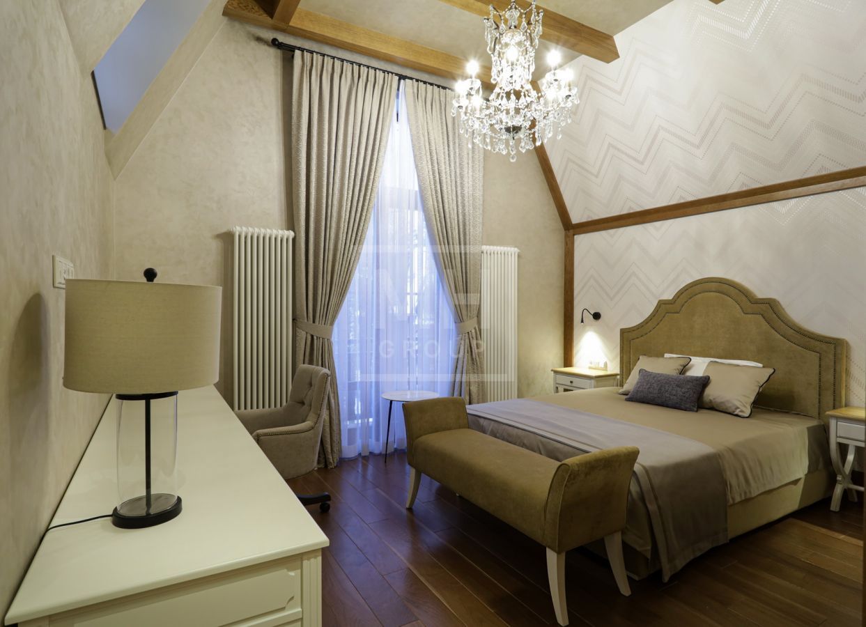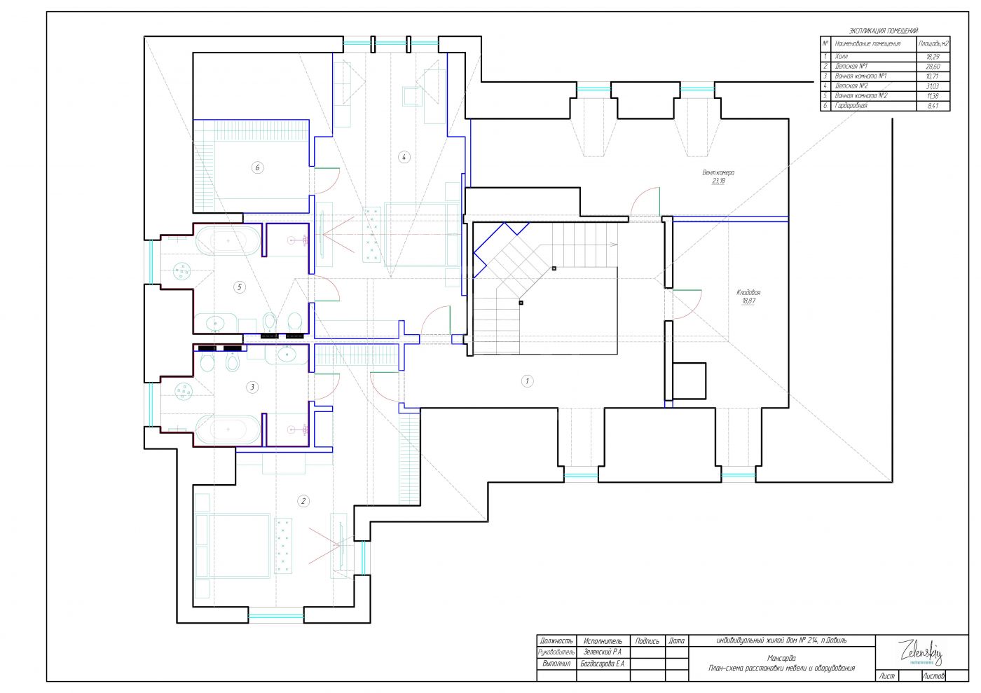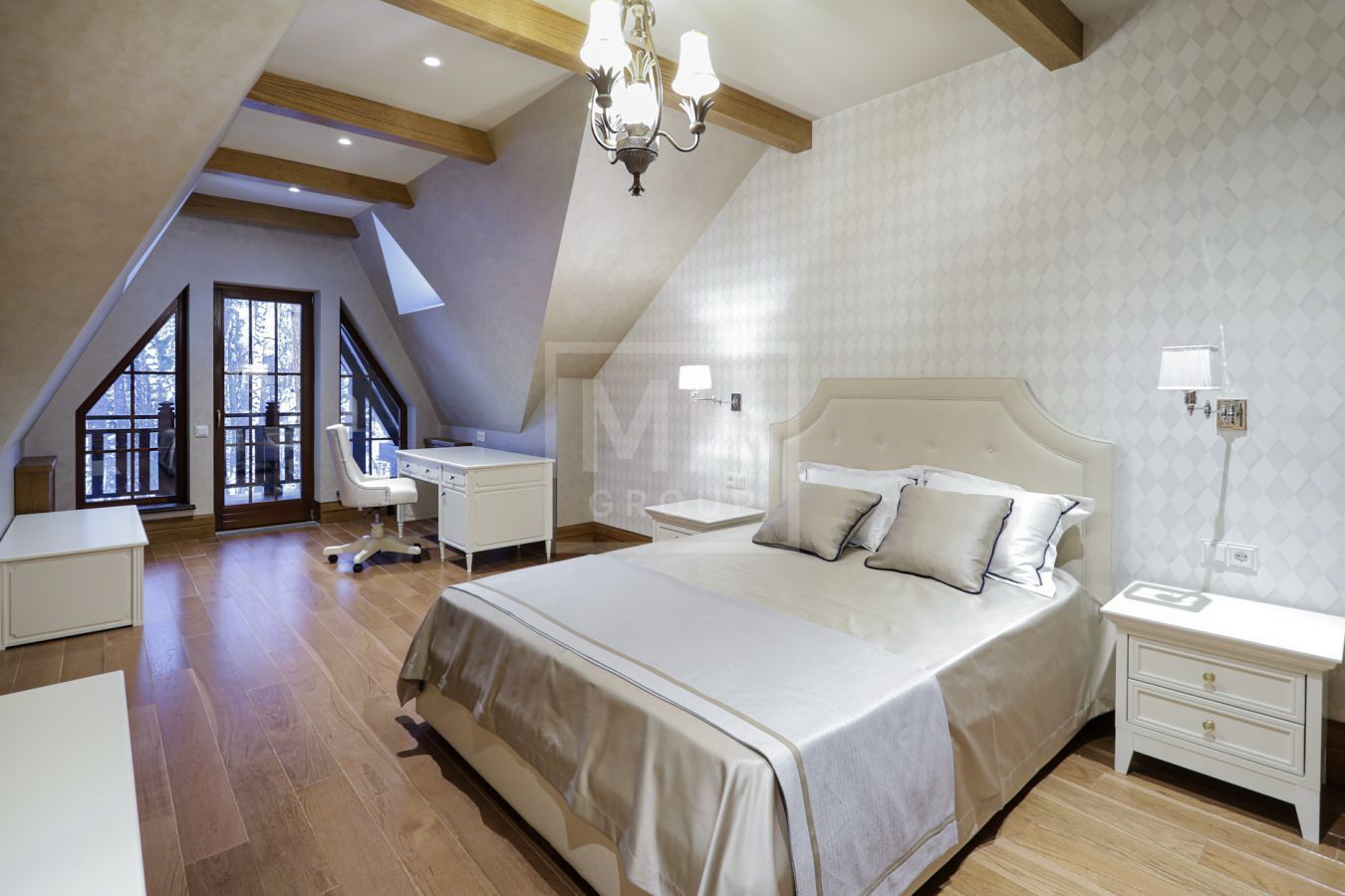Мансарда: Холл, 2 спальни со своей ванной комнатой, гардеробной и выходом на балкон, кладовая.
