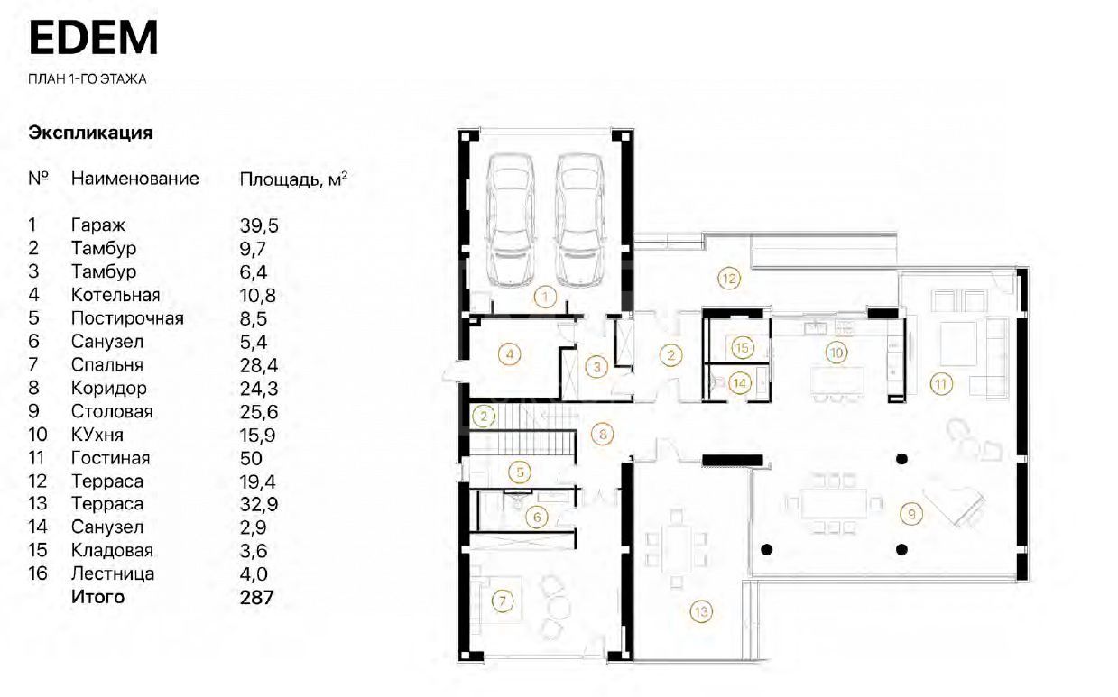 Этаж 1: Прихожая, спальня с с/у, кухня, столовая, гостиная, с/у, постирочная, кладовая, котельная, гараж