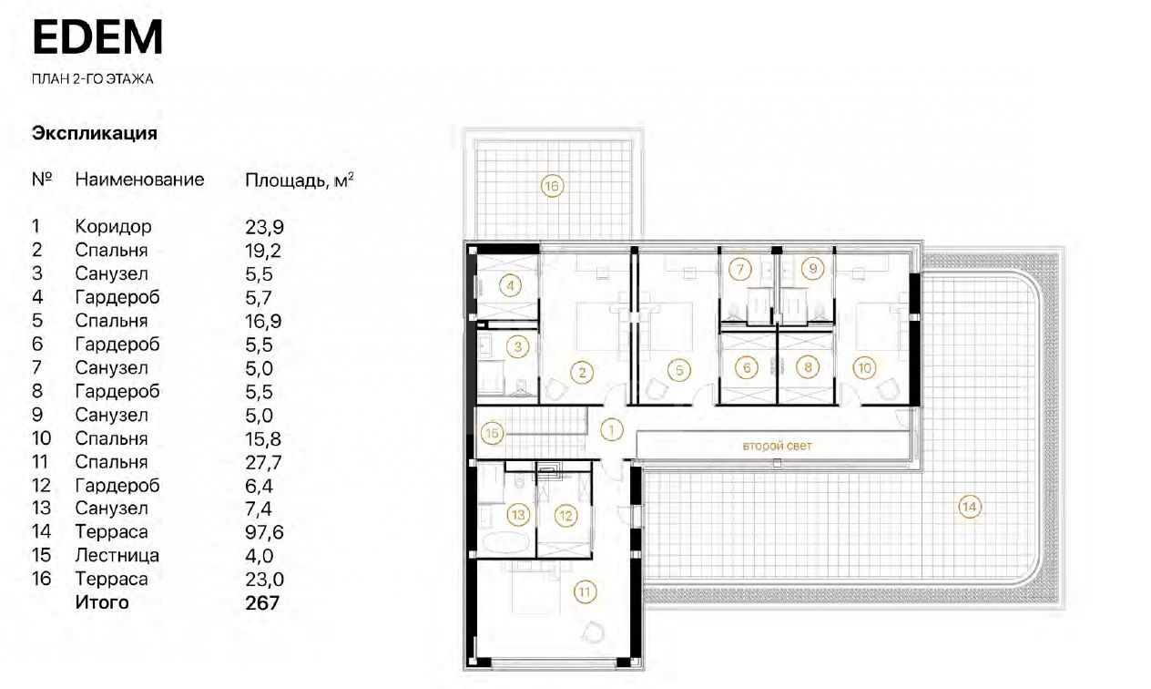 Этаж 2: мастер спальня с с/у и гардеробными, 3 спальни с с/у и гардеробными