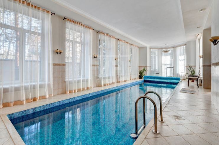Этаж 1: Холл, гостиная с камином и вторым светом, кухня, столовая, кабинет-спальня, с/у, бассейн, сауна