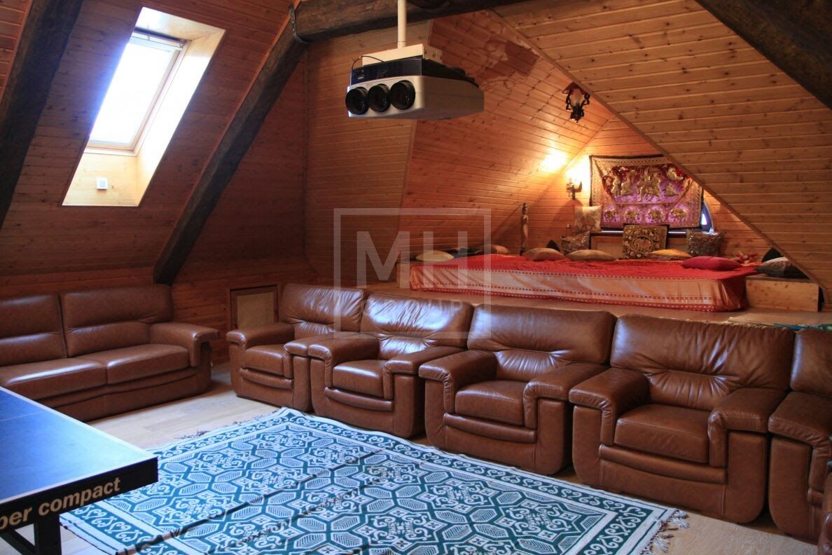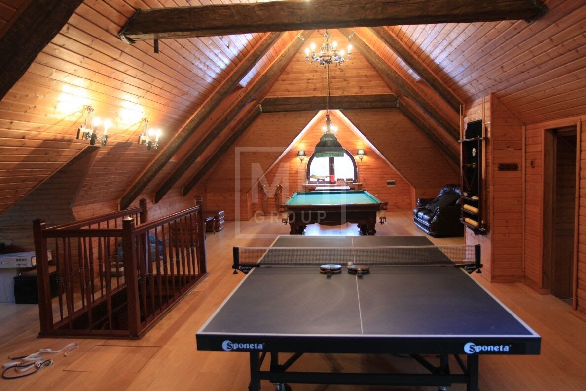 Мансарда: Мансарда представляет собой большое пространство с бильярдом, настольным теннисом, кинотеатром, зоной отдыха и ванной комнатой.