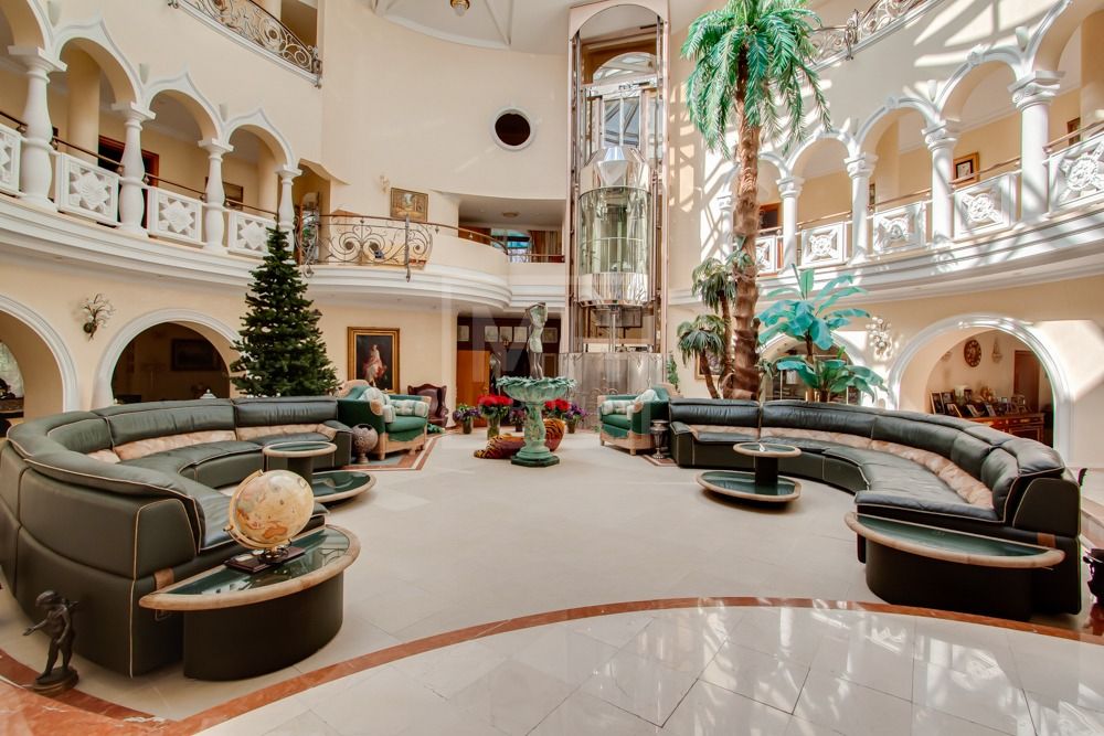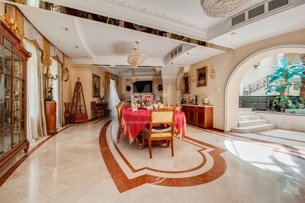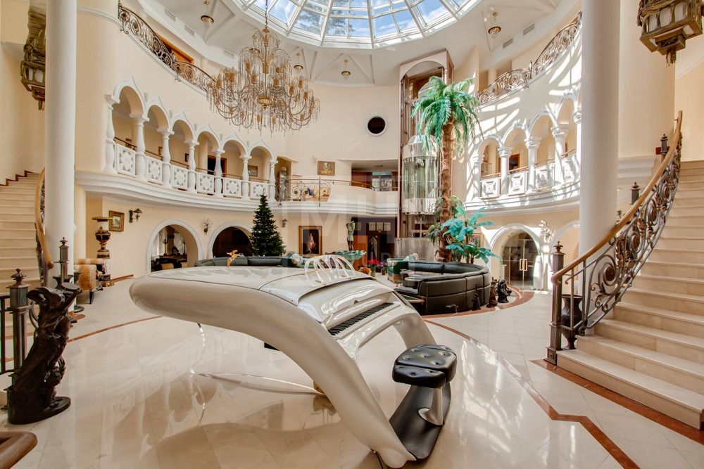 Этаж 1: холл, большая светлая гостиная со вторым светом и стеклянным куполом, малая гостиная с камином и ТВ-зоной, кабинет, кухня, большая столовая с камином, молельная комната, З гардеробные, 2 гостевых санузла