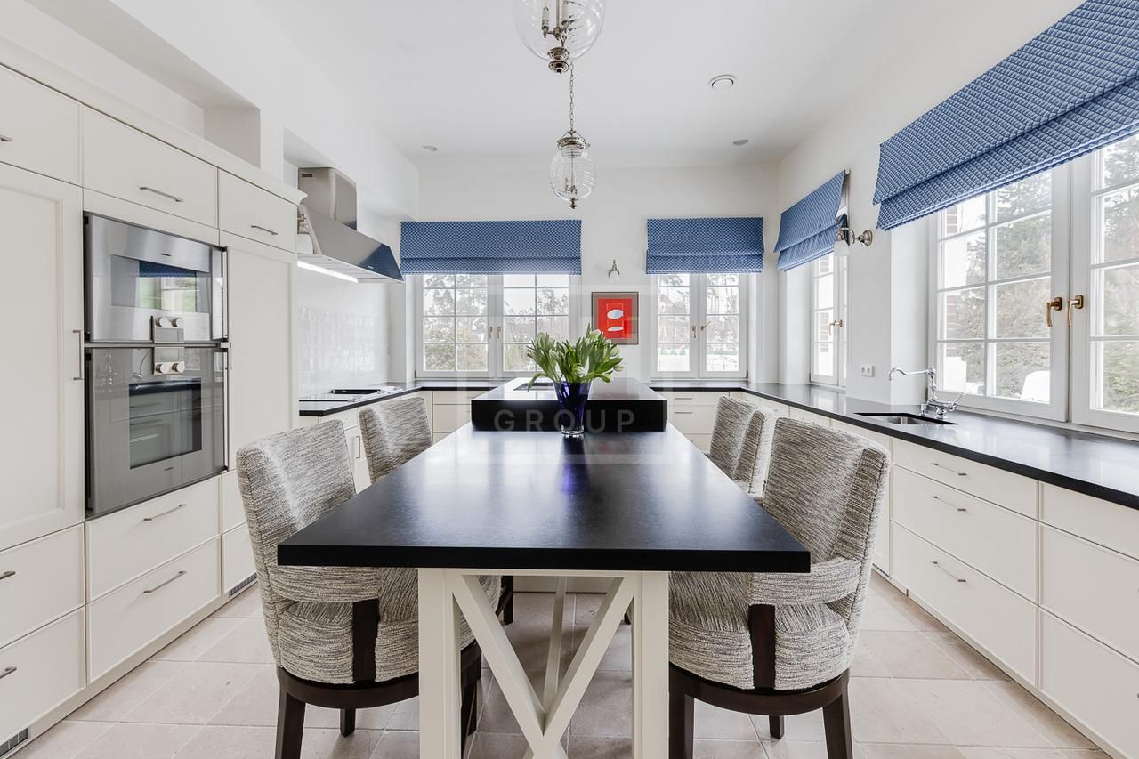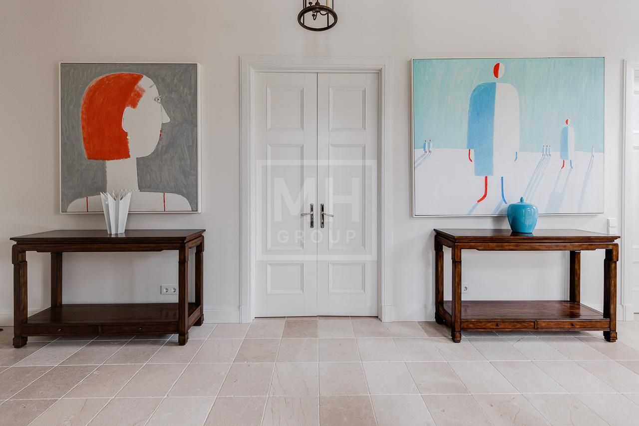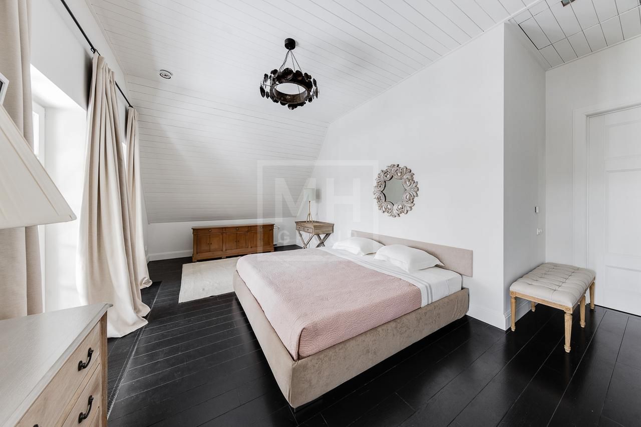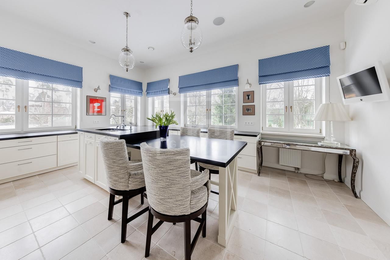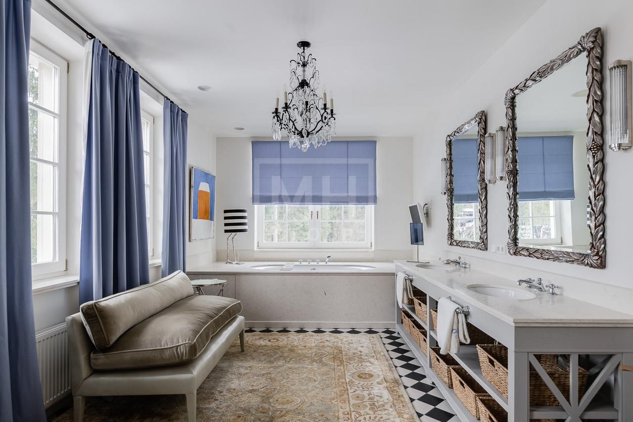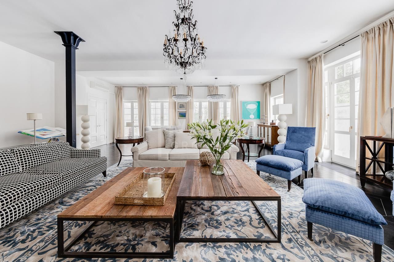 Эксклюзивный дом в поселке «Довиль» в 10 км от МКАД по Минскому шоссе. Коттеджный поселок расположен в 10 км от Москвы на берегу лесного озера сказочной красоты. Великолепный пейзаж, близость к столице и одновременно уединенность парка привели к идее создания поселка с единой, четко выверенной архитектурной концепцией. Прообразом комплекса стал фешенебельный французский город-курорт Довиль.В дизайне преобладает нормандский стиль, а излишне декоративный облик дома нивелирован лаконичным и изысканным интерьером, в котором работают холодный нейтральный фон и нежная палитра цветов. Высокие потолки, большие окна, светлые тона, простор и легкость в каждой детали дома настроят жильцов на комфорт и уединение. В интерьере в унисон звучат винтажная мебель от ведущих дизайнеров и антикварные предметы декора. Ralph Lauren Home, Grange, Baker, Ochre, Fdc, Porta Romana – это только малая часть брендов, исключительные экземпляры которых украшают дом. Тщательно подобраны мебель и текстиль, освещение ипредметы декора от ведущих мировых производителей. Вгостиной журнальные столики со столешницами из антикварных досок гармонично сочетаются с диванами и столиками Ralph Lauren. Каминный портал выполнен назаказ на фабрике Artishock из известняка и мрамора, а экрандля камина является винтажным наследием из Испании. Мебель на кухне со столешницей из матового гранита выполнена мастерами Rod Punkt, подвесные светильники – Summer Hill, а бра – Urban Archeology. Уникальные предметы декора и картины в доме выполнены художником, архитектором и мультипликатором Петром Бронфиным.