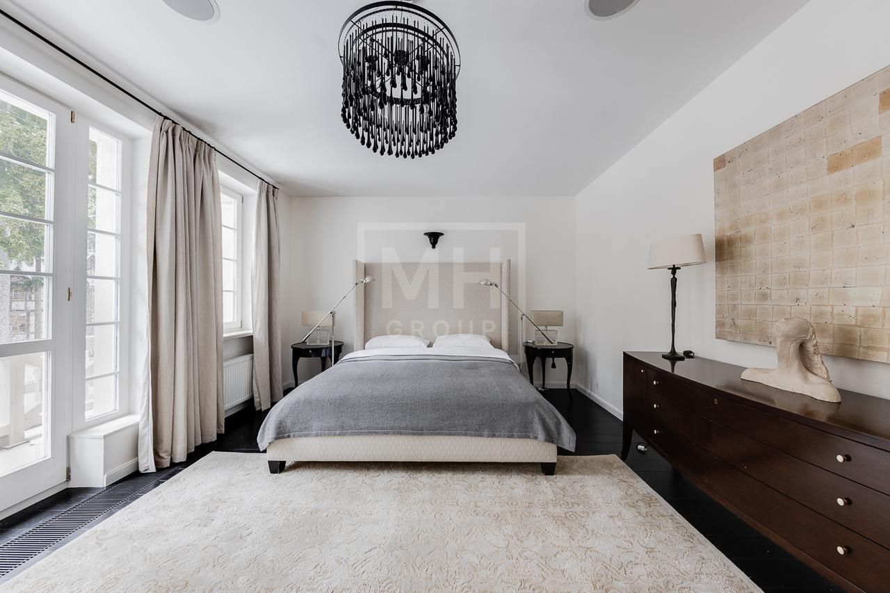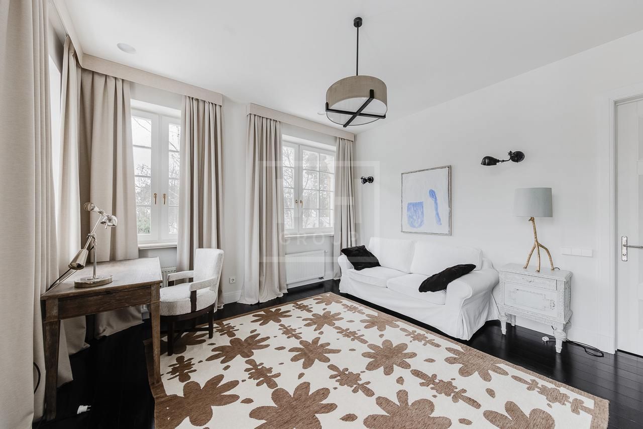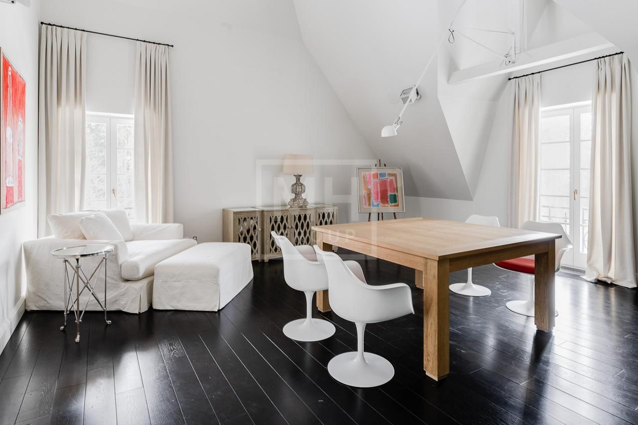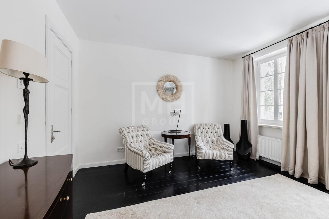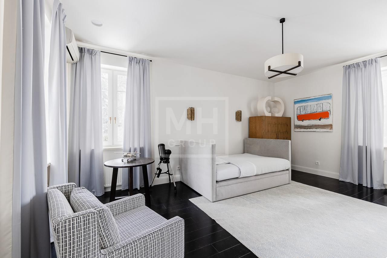 Эксклюзивный дом в поселке «Довиль» в 10 км от МКАД по Минскому шоссе. Коттеджный поселок расположен в 10 км от Москвы на берегу лесного озера сказочной красоты. Великолепный пейзаж, близость к столице и одновременно уединенность парка привели к идее создания поселка с единой, четко выверенной архитектурной концепцией. Прообразом комплекса стал фешенебельный французский город-курорт Довиль.В дизайне преобладает нормандский стиль, а излишне декоративный облик дома нивелирован лаконичным и изысканным интерьером, в котором работают холодный нейтральный фон и нежная палитра цветов. Высокие потолки, большие окна, светлые тона, простор и легкость в каждой детали дома настроят жильцов на комфорт и уединение. В интерьере в унисон звучат винтажная мебель от ведущих дизайнеров и антикварные предметы декора. Ralph Lauren Home, Grange, Baker, Ochre, Fdc, Porta Romana – это только малая часть брендов, исключительные экземпляры которых украшают дом. Тщательно подобраны мебель и текстиль, освещение ипредметы декора от ведущих мировых производителей. Вгостиной журнальные столики со столешницами из антикварных досок гармонично сочетаются с диванами и столиками Ralph Lauren. Каминный портал выполнен назаказ на фабрике Artishock из известняка и мрамора, а экрандля камина является винтажным наследием из Испании. Мебель на кухне со столешницей из матового гранита выполнена мастерами Rod Punkt, подвесные светильники – Summer Hill, а бра – Urban Archeology. Уникальные предметы декора и картины в доме выполнены художником, архитектором и мультипликатором Петром Бронфиным.