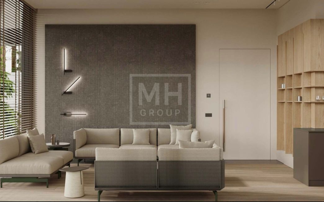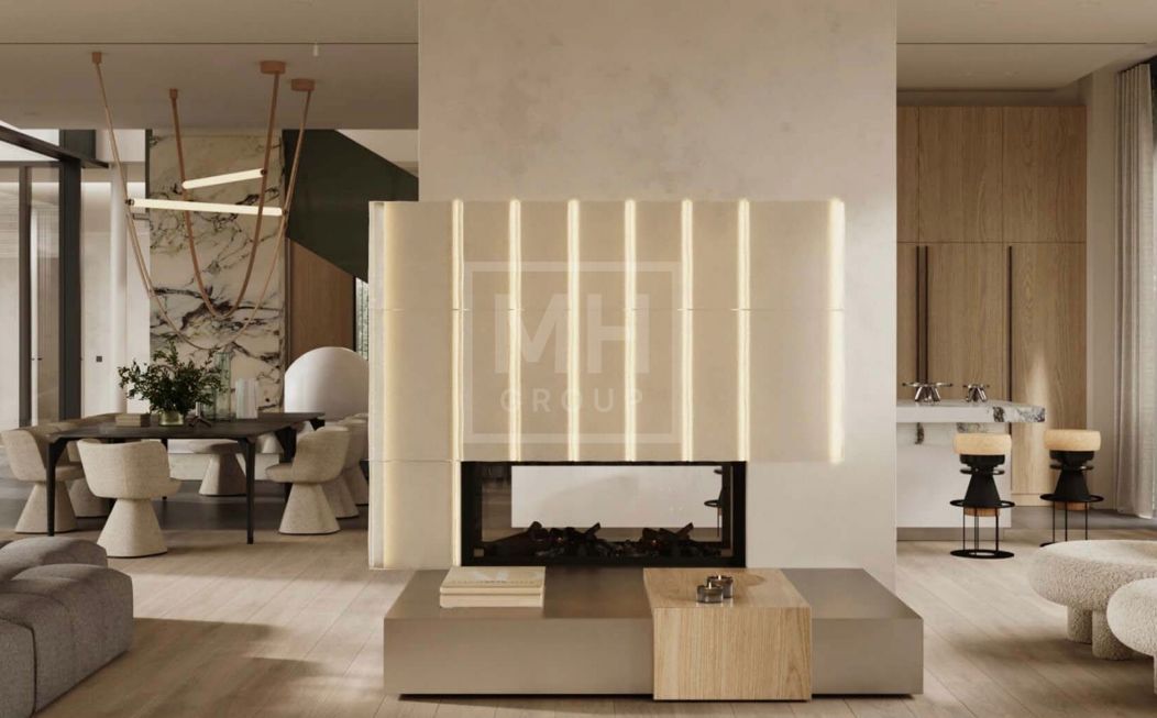 Этаж 1: Просторная кухня-гостиная с панорамными окнами и выходом на улицу к зоне барбекю, гостевая спальня с собственной ванной комнатой, парадная лестница на второй этаж, холл с проходной гардеробной и гостевым с/у. СПА Комплекс: комната отдыха с небольшой кухней, сауна с внешней топочной, раздевалка, с/у , массажная комната, терраса с уличным бассейном. Технический блок: техническая кухня , постирочная , серверная / кладовая , гараж на 3 м/м , котельная с входом с улицы и лестницей на второй этаж в блок персонала.