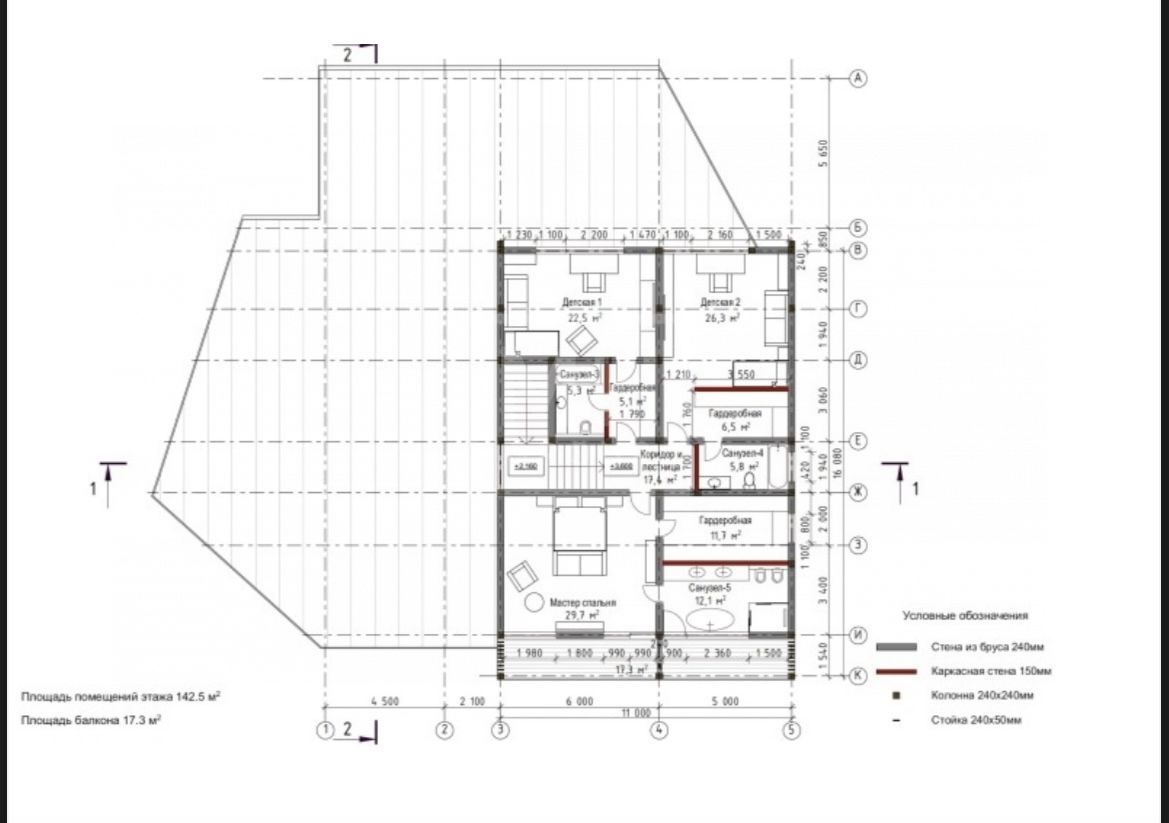 Этаж 2: Хозяйская спальня с гардеробной и санузлом, 2 детские спальни с санузлами и гардеробными, холл.