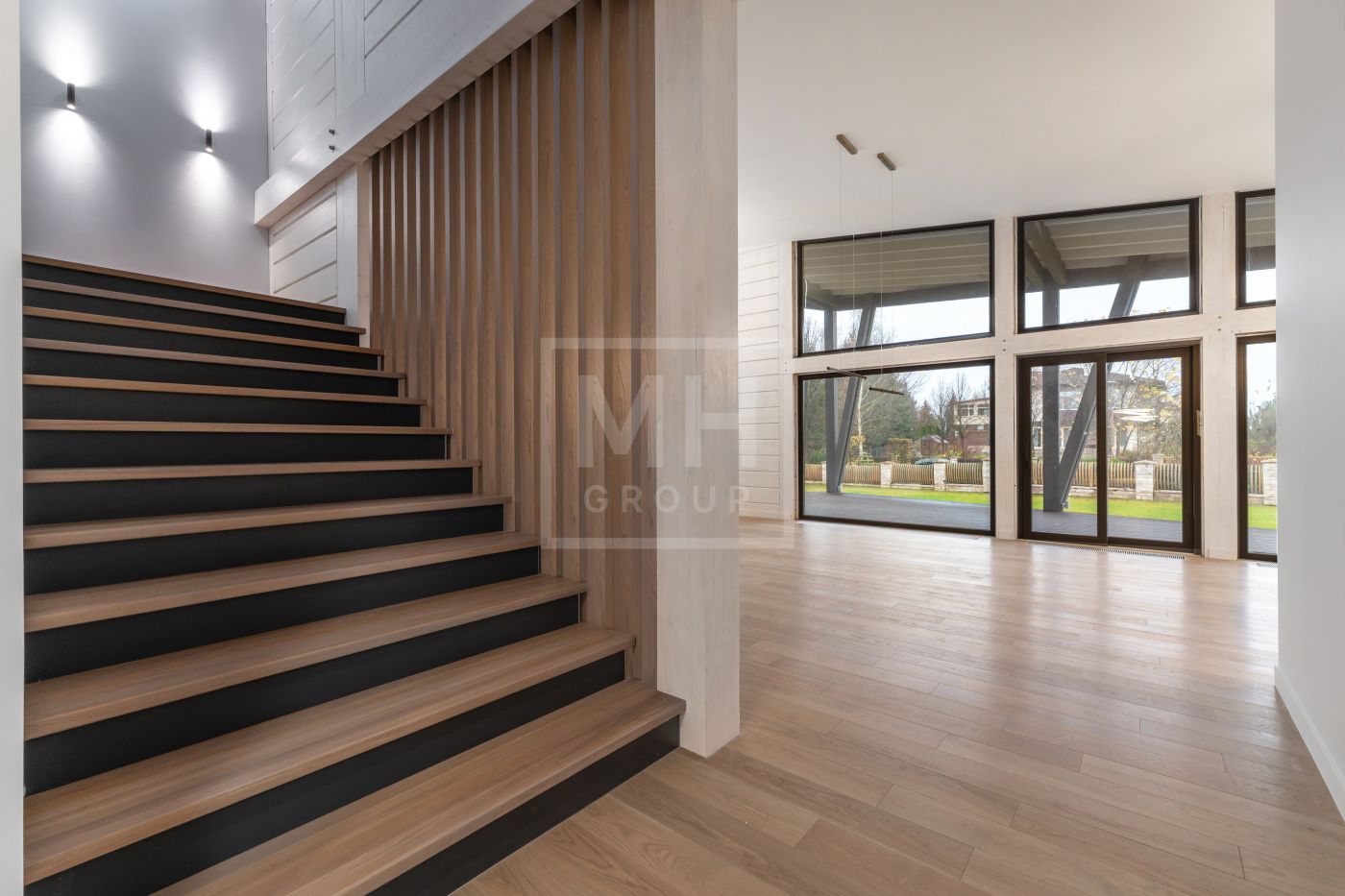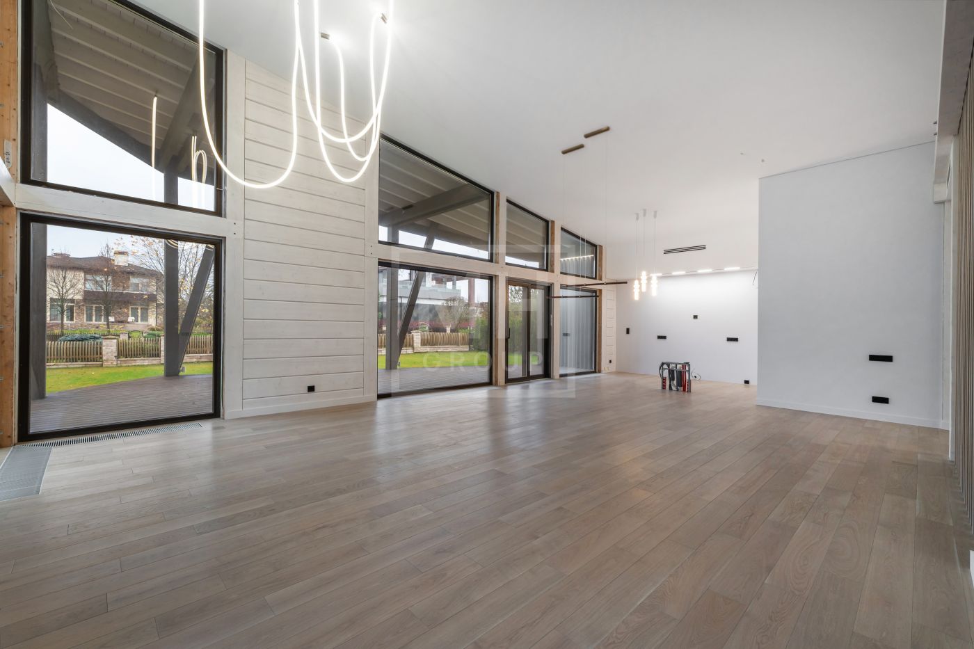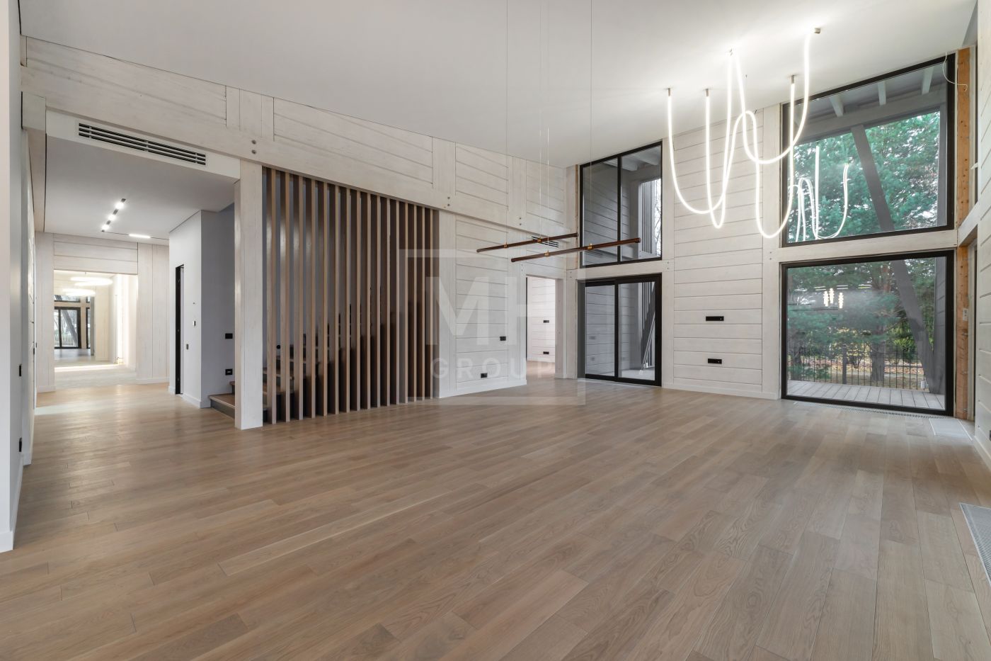 Этаж 1: Прихожая, большая гардеробная, гостевой санузел, кухня-столовая- гостиная с выходом на террасу 90м2, постирочная, кабинет, гостевая спальня с санузлом, котельная, кладовая для спортивного и садового инвентаря, навес для авто.