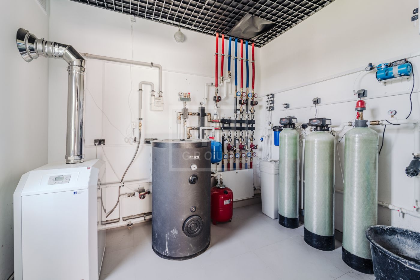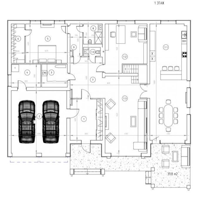 Этаж 1: Холл, кухня, гостиная с выходом на террасу, спальня с санузлом, котельная, постирочная, кабинет, гараж.