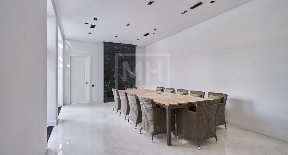 Этаж 1: просторная гостиная с дровяным камином , высотой потолка 6 м, окнами в пол и выходом в сад , кабинет с санузлом, спальня с просторным санузлом и гардеробной , две гардеробные, постирочная, проф.кухня с отдельным выходом во внутренний двор, отдельный вход для персонала .