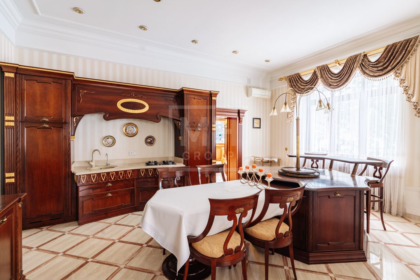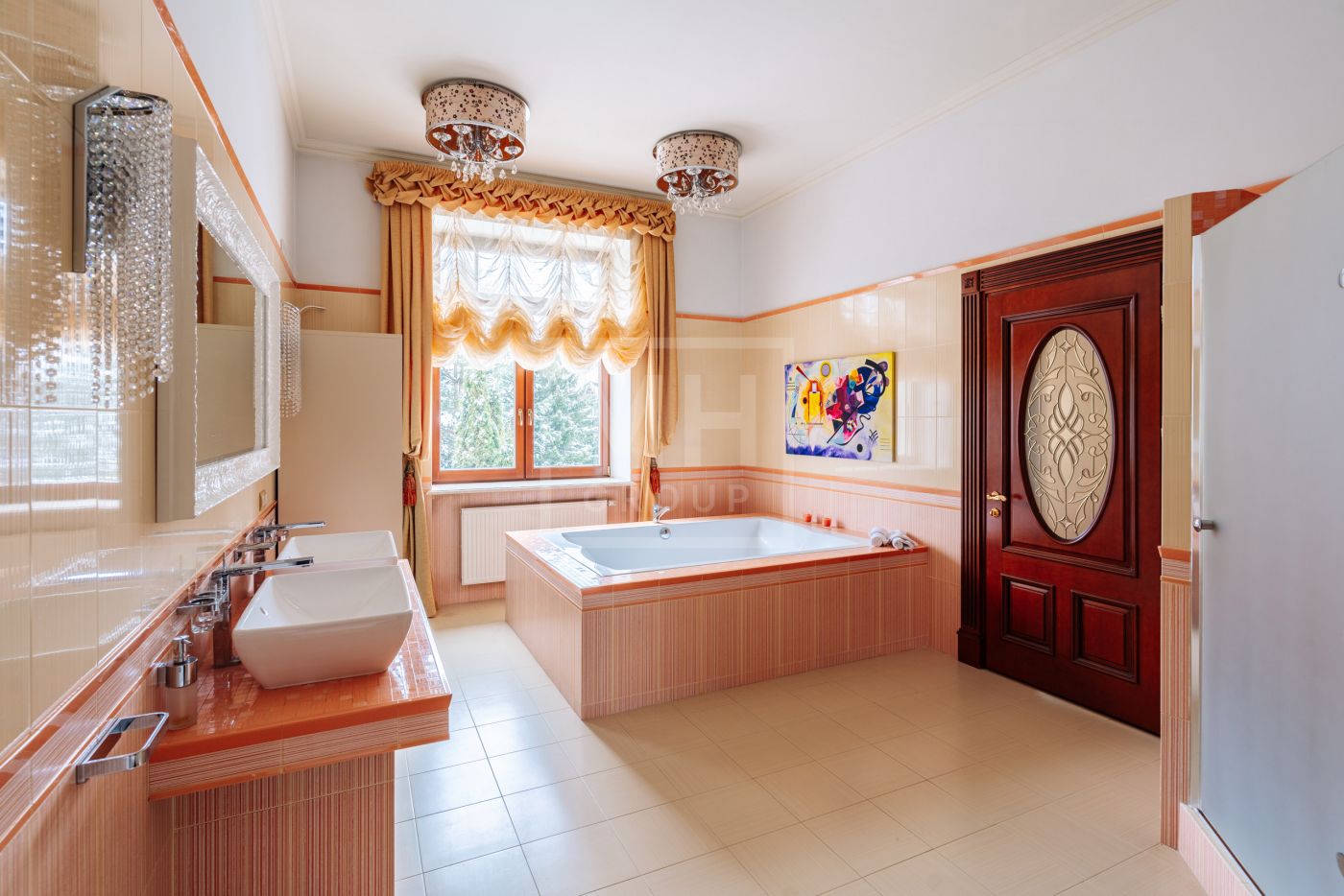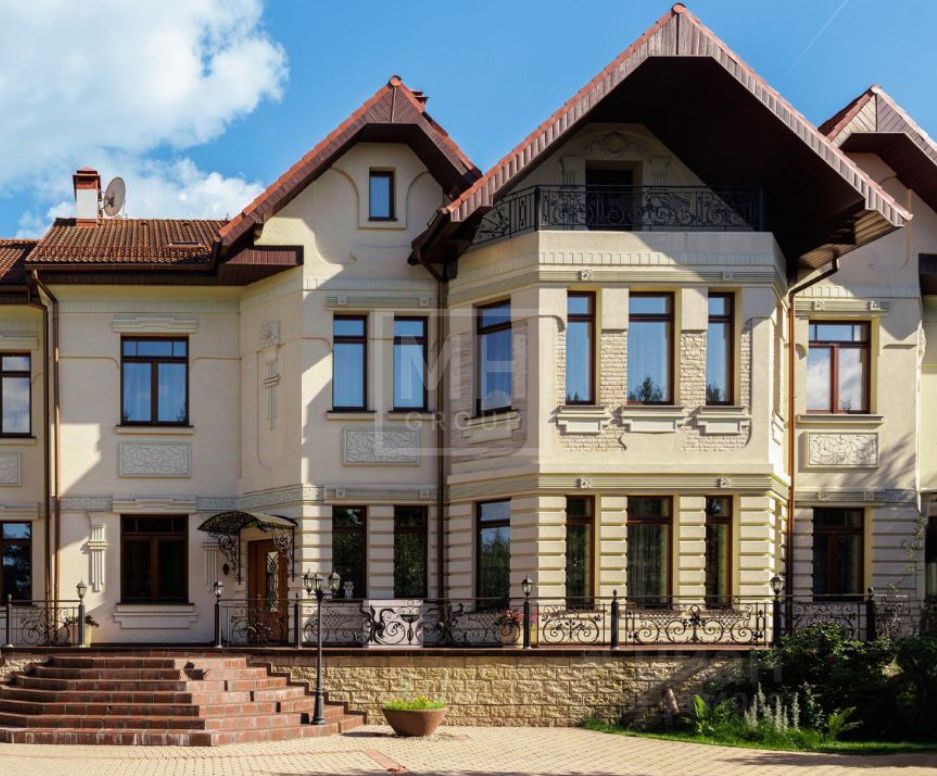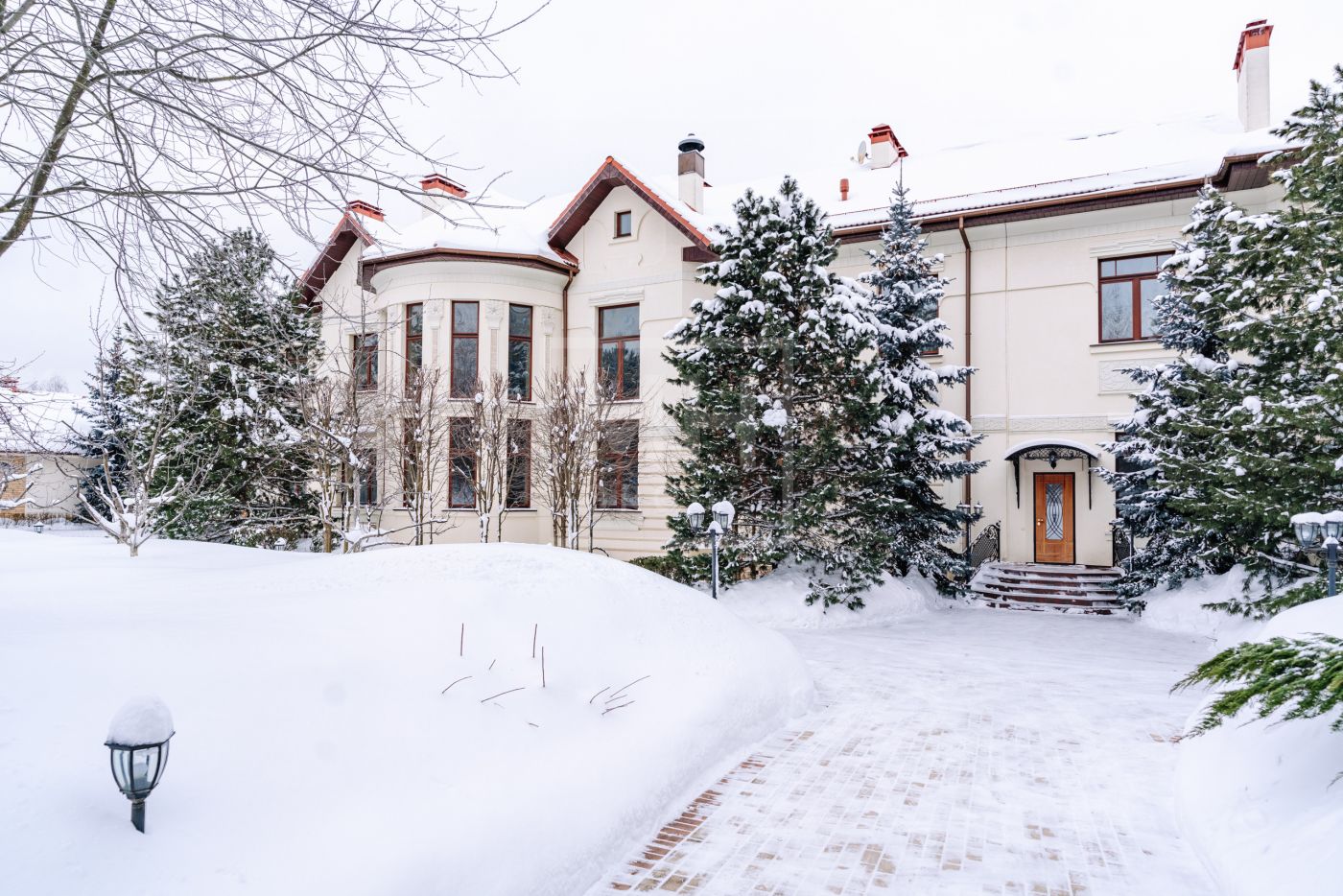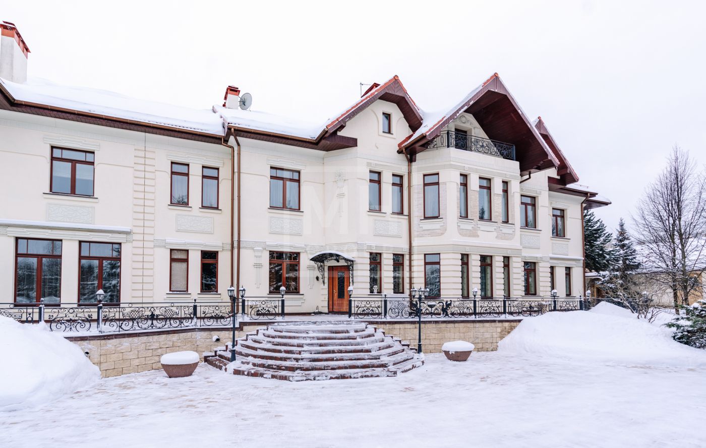 Резиденция на просторном участке с собственным озером. Отделка фасада выполнена из светло-бежевых оттенков штукатурки, что вместе с кровлей бордовых тонов керамической черепицы делают дом невероятно красивым. Ремонт выполнен в классическом стиле с применением дорогостоящих материалов. Высокие потолки в помещениях и второй свет в зоне гостиной наполняют дом светом и делают его очень просторным. Планировкой резиденции предусмотрены 3 спальни, 2 гостиные, кухня, 2 столовые, кабинет и SPA-зона с бассейном, хамамом и сауной. На просторном лесном участке кроме основного дома расположены гаража с квартирой для персонала, летний домик, беседка и зона барбекю.