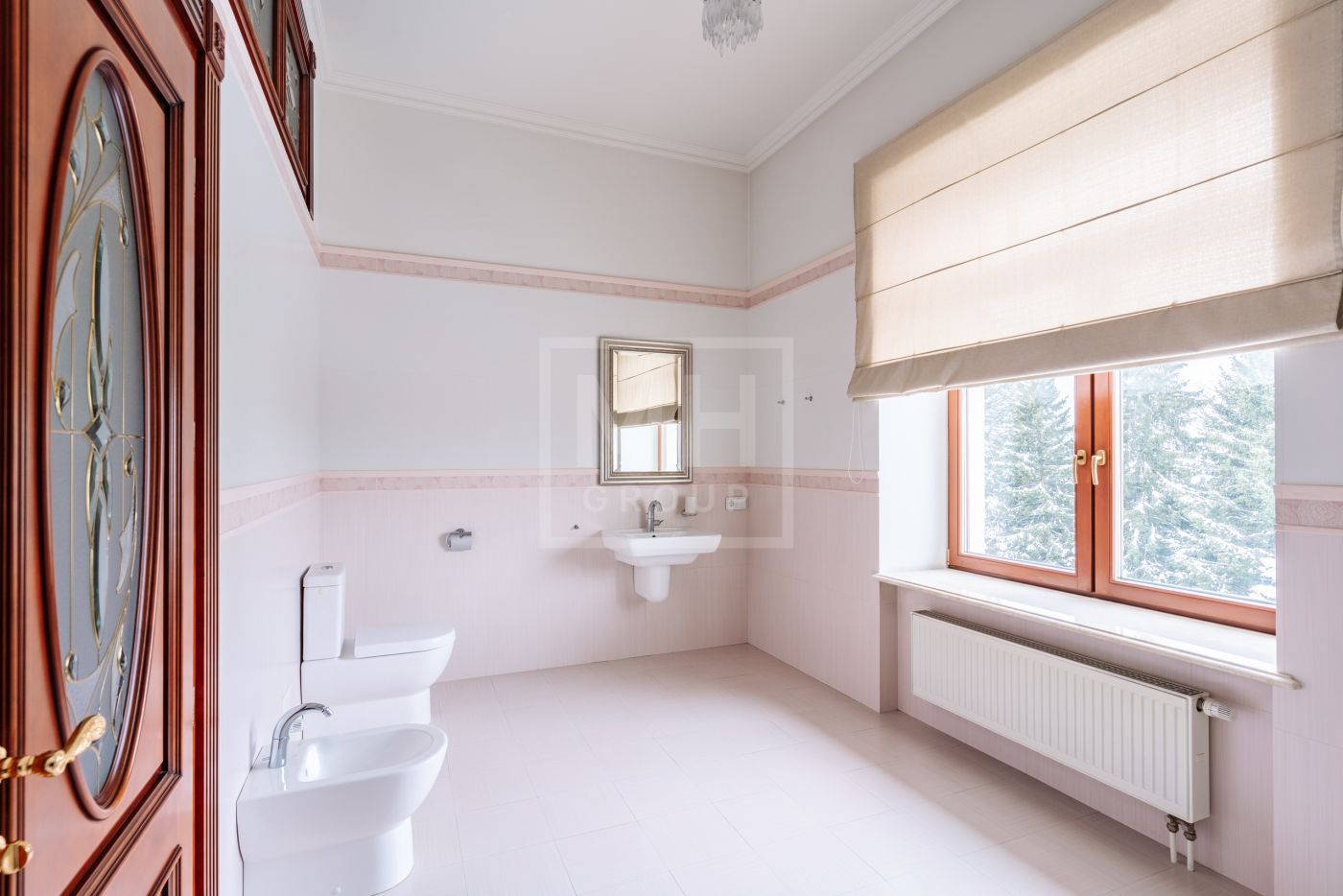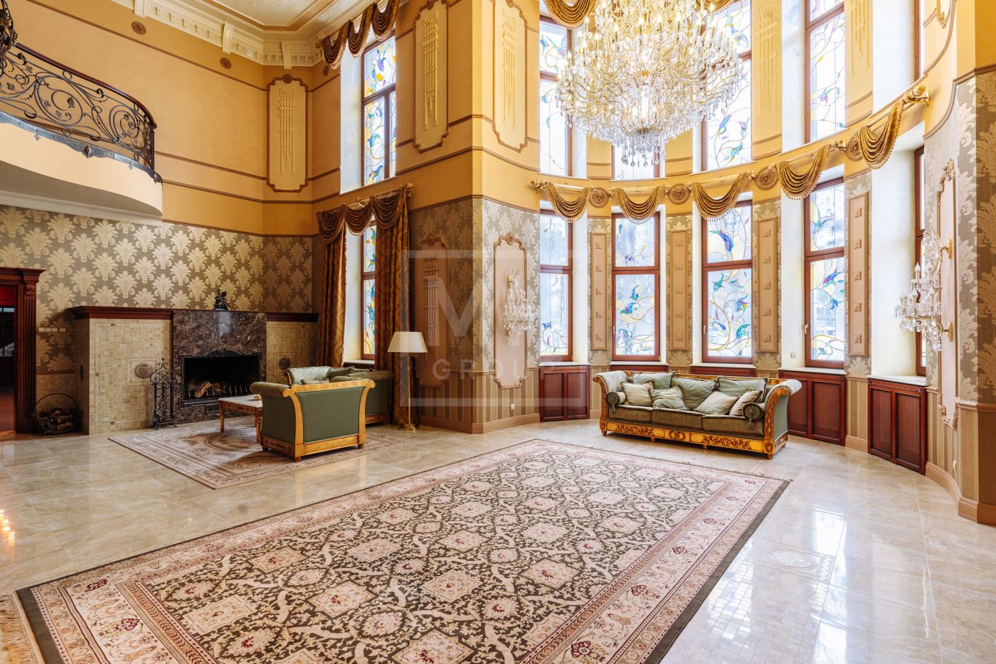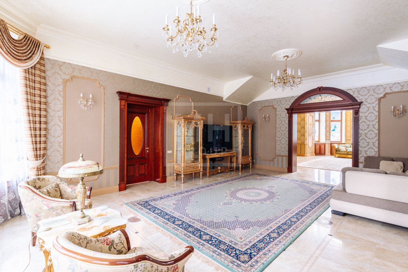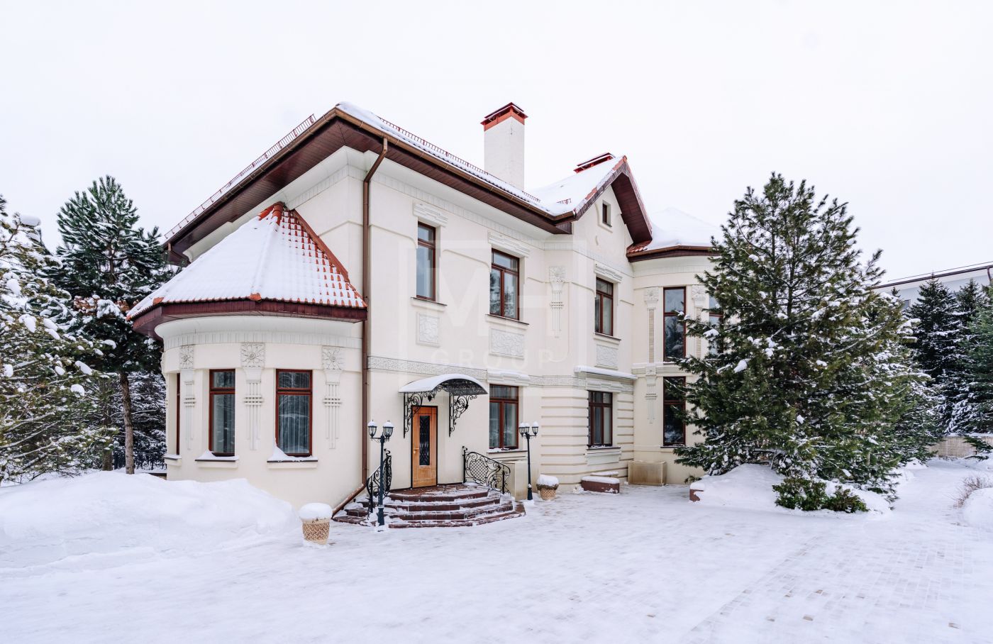 Резиденция на просторном участке с собственным озером. Отделка фасада выполнена из светло-бежевых оттенков штукатурки, что вместе с кровлей бордовых тонов керамической черепицы делают дом невероятно красивым. Ремонт выполнен в классическом стиле с применением дорогостоящих материалов. Высокие потолки в помещениях и второй свет в зоне гостиной наполняют дом светом и делают его очень просторным. Планировкой резиденции предусмотрены 3 спальни, 2 гостиные, кухня, 2 столовые, кабинет и SPA-зона с бассейном, хамамом и сауной. На просторном лесном участке кроме основного дома расположены гаража с квартирой для персонала, летний домик, беседка и зона барбекю.