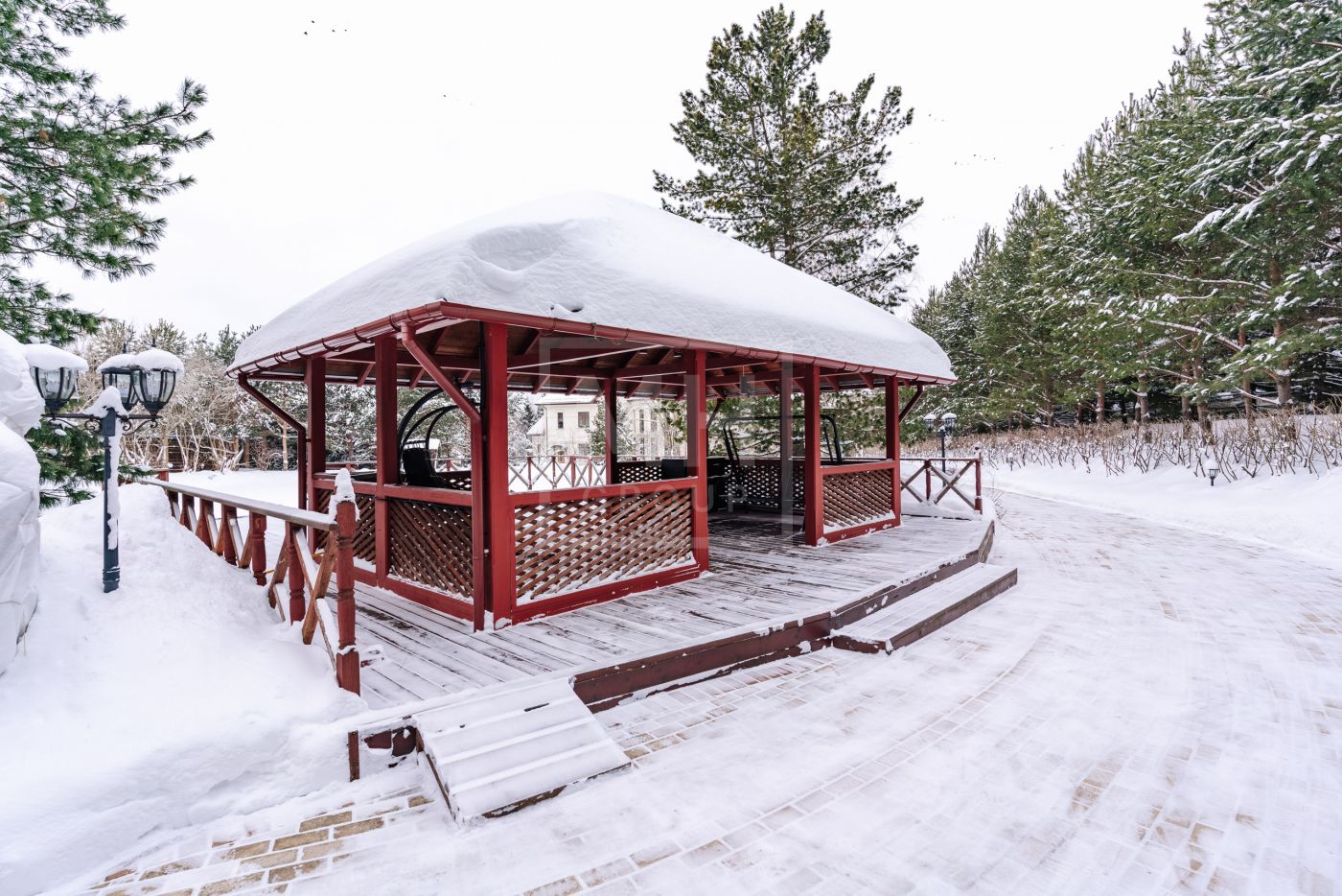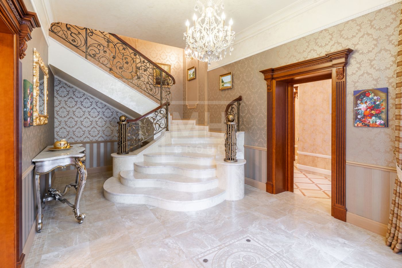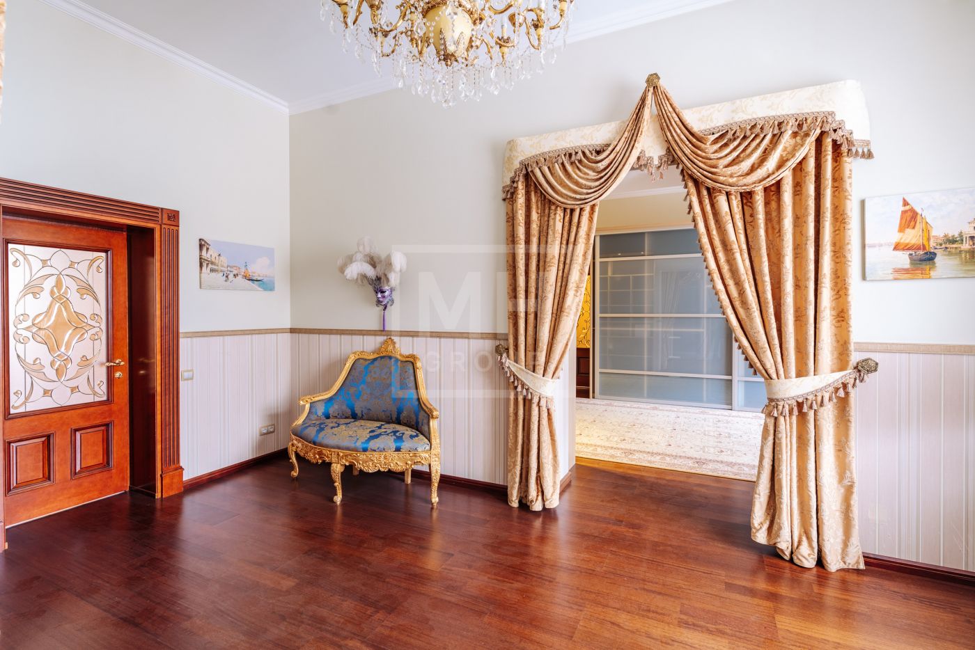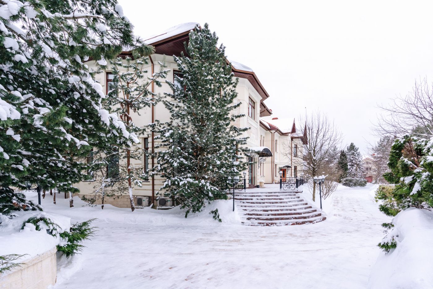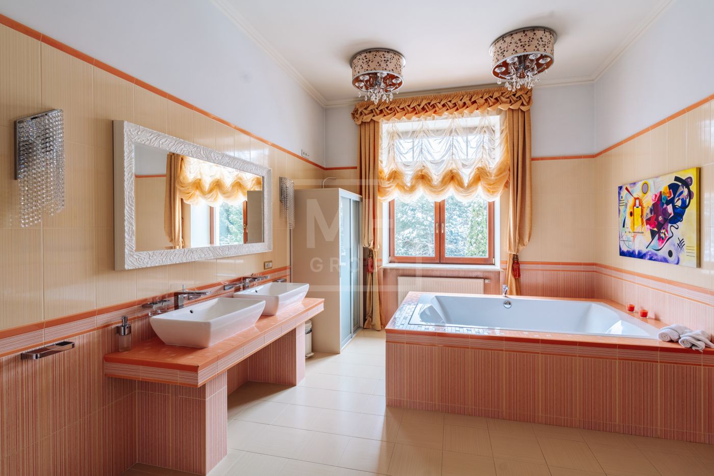 Резиденция на просторном участке с собственным озером. Отделка фасада выполнена из светло-бежевых оттенков штукатурки, что вместе с кровлей бордовых тонов керамической черепицы делают дом невероятно красивым. Ремонт выполнен в классическом стиле с применением дорогостоящих материалов. Высокие потолки в помещениях и второй свет в зоне гостиной наполняют дом светом и делают его очень просторным. Планировкой резиденции предусмотрены 3 спальни, 2 гостиные, кухня, 2 столовые, кабинет и SPA-зона с бассейном, хамамом и сауной. На просторном лесном участке кроме основного дома расположены гаража с квартирой для персонала, летний домик, беседка и зона барбекю.