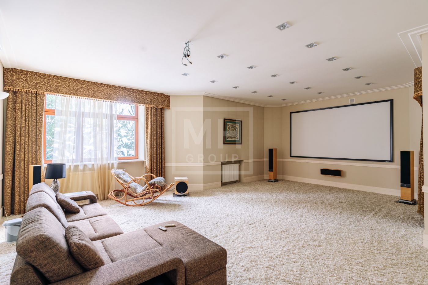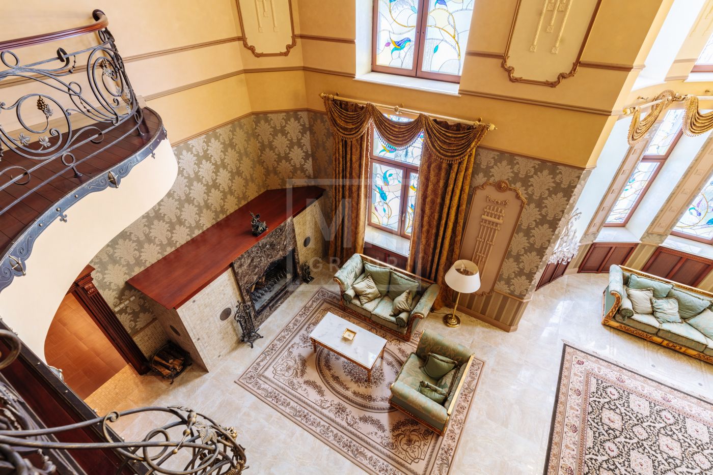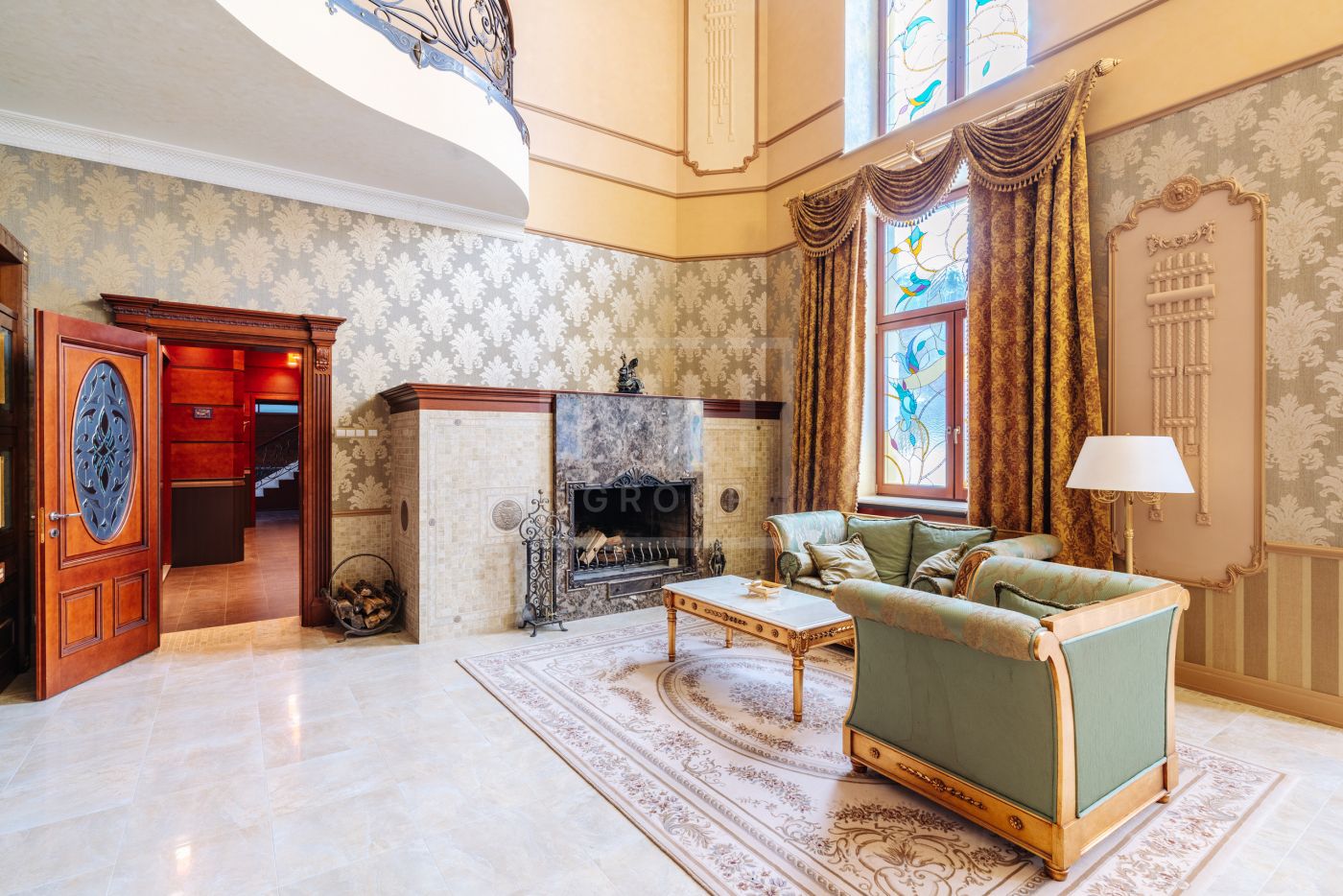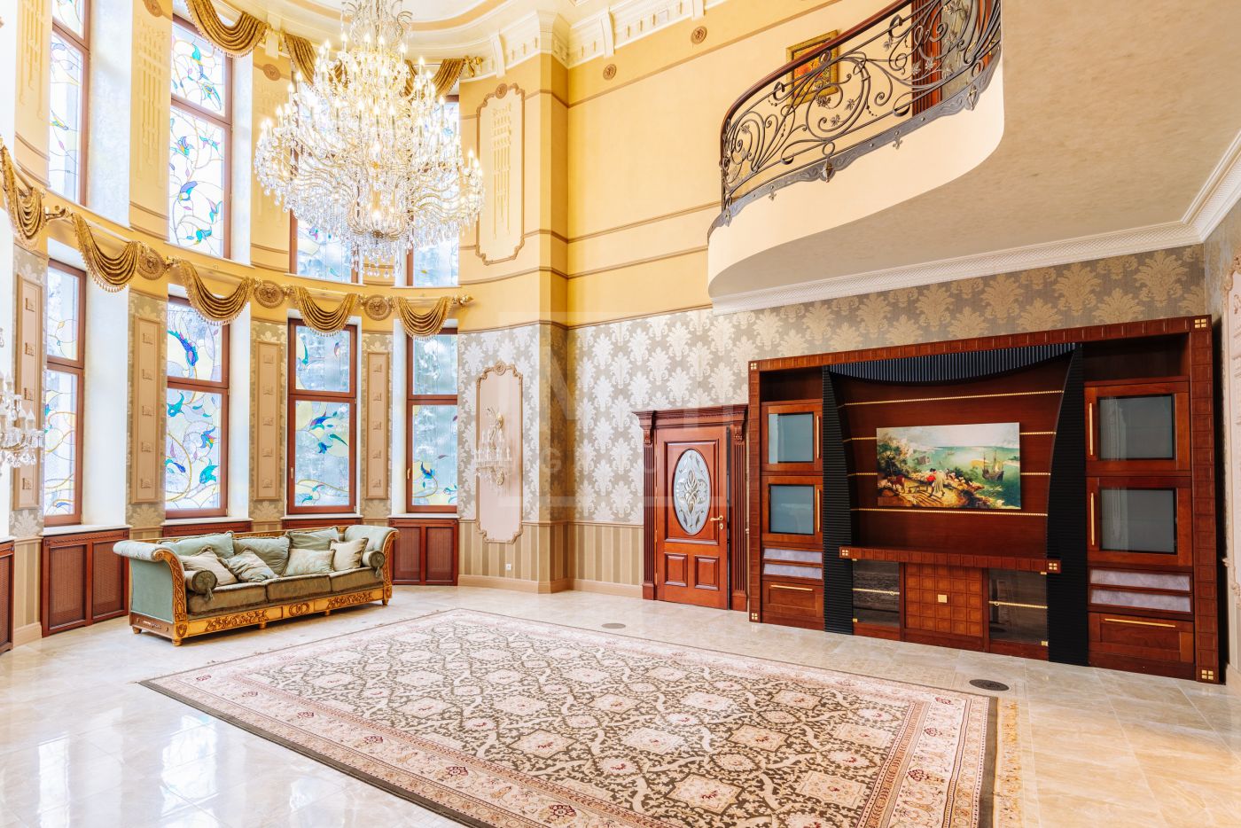 Резиденция на просторном участке с собственным озером. Отделка фасада выполнена из светло-бежевых оттенков штукатурки, что вместе с кровлей бордовых тонов керамической черепицы делают дом невероятно красивым. Ремонт выполнен в классическом стиле с применением дорогостоящих материалов. Высокие потолки в помещениях и второй свет в зоне гостиной наполняют дом светом и делают его очень просторным. Планировкой резиденции предусмотрены 3 спальни, 2 гостиные, кухня, 2 столовые, кабинет и SPA-зона с бассейном, хамамом и сауной. На просторном лесном участке кроме основного дома расположены гаража с квартирой для персонала, летний домик, беседка и зона барбекю.