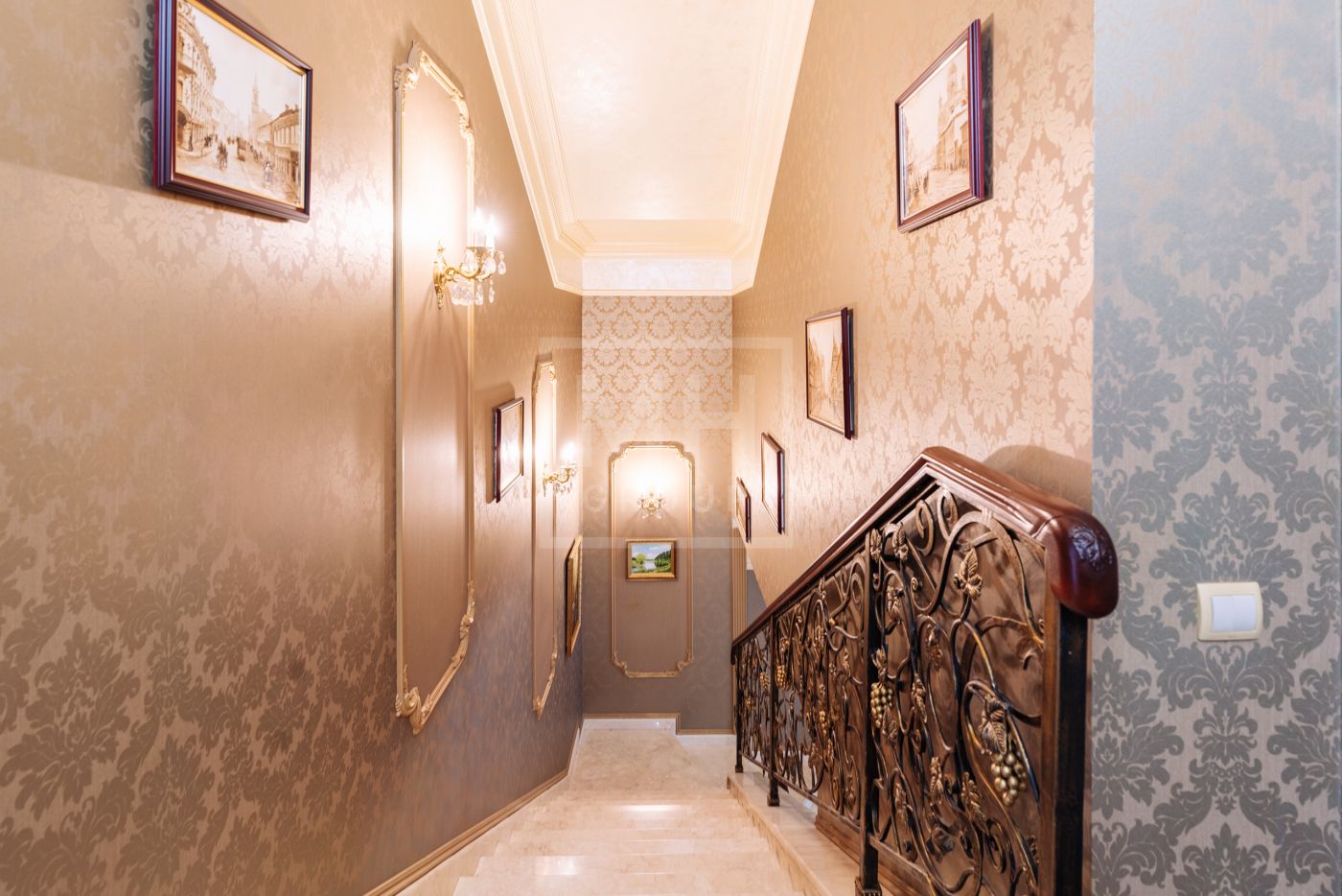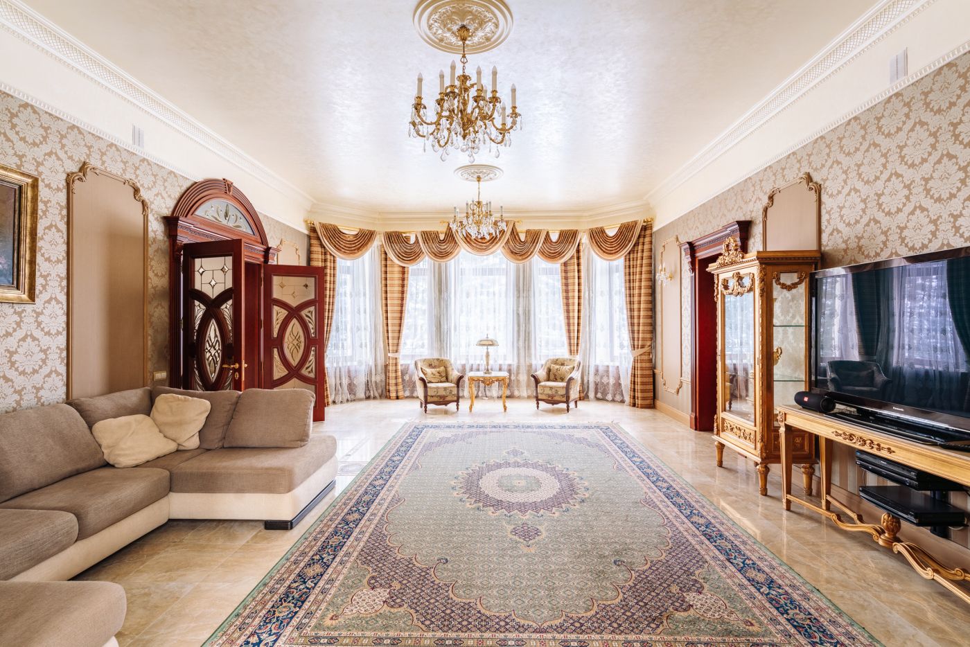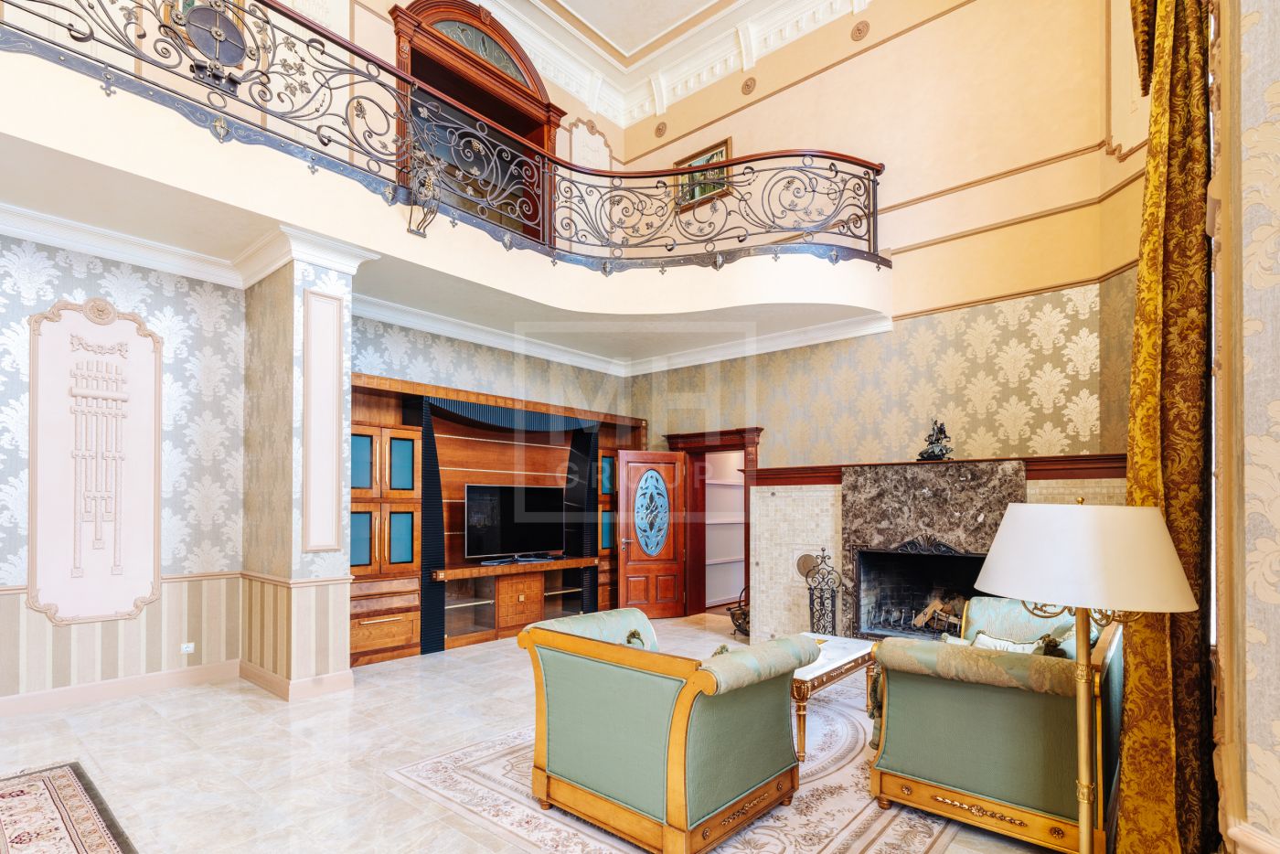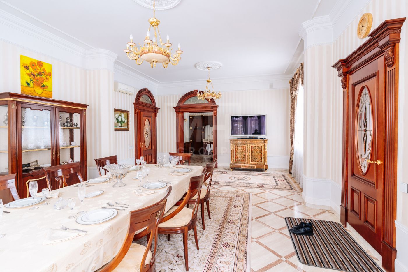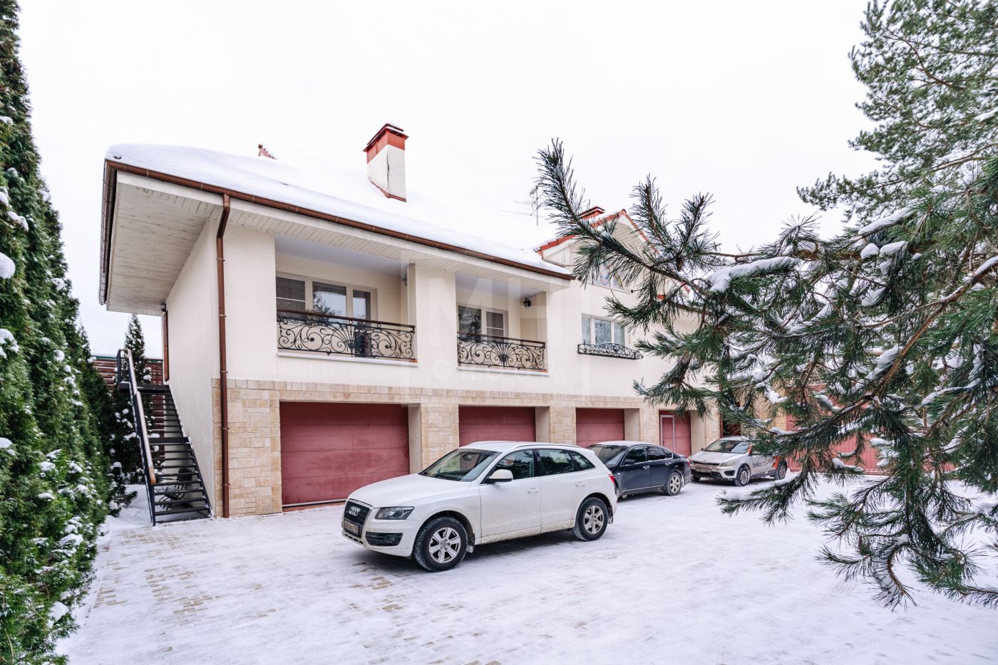 Резиденция на просторном участке с собственным озером. Отделка фасада выполнена из светло-бежевых оттенков штукатурки, что вместе с кровлей бордовых тонов керамической черепицы делают дом невероятно красивым. Ремонт выполнен в классическом стиле с применением дорогостоящих материалов. Высокие потолки в помещениях и второй свет в зоне гостиной наполняют дом светом и делают его очень просторным. Планировкой резиденции предусмотрены 3 спальни, 2 гостиные, кухня, 2 столовые, кабинет и SPA-зона с бассейном, хамамом и сауной. На просторном лесном участке кроме основного дома расположены гаража с квартирой для персонала, летний домик, беседка и зона барбекю.