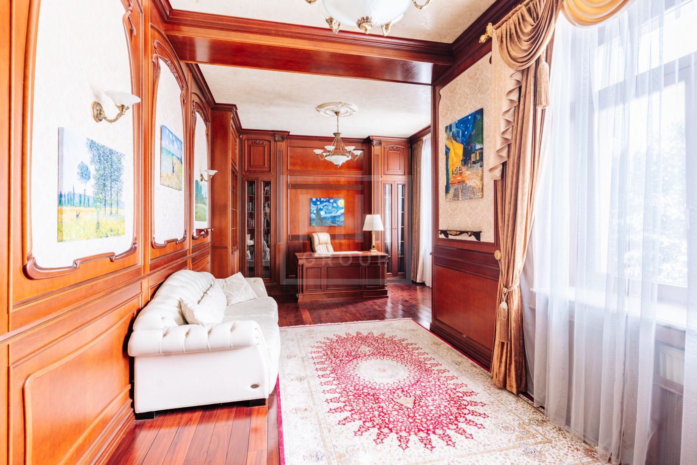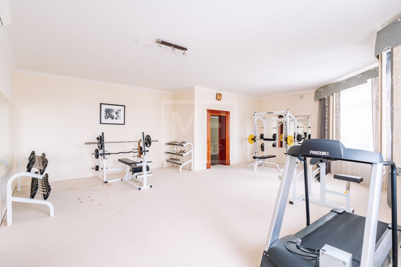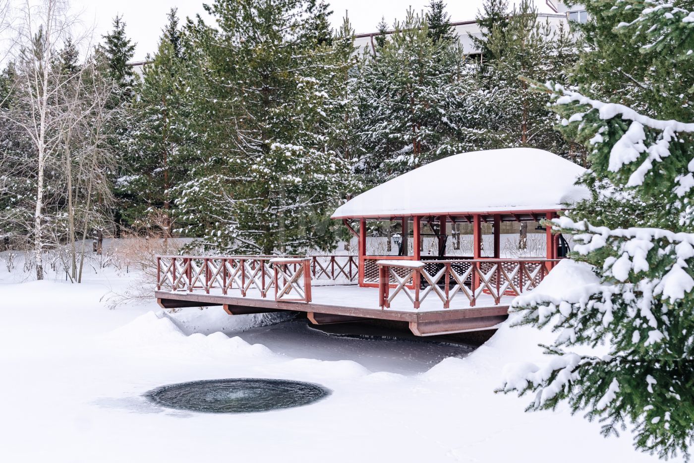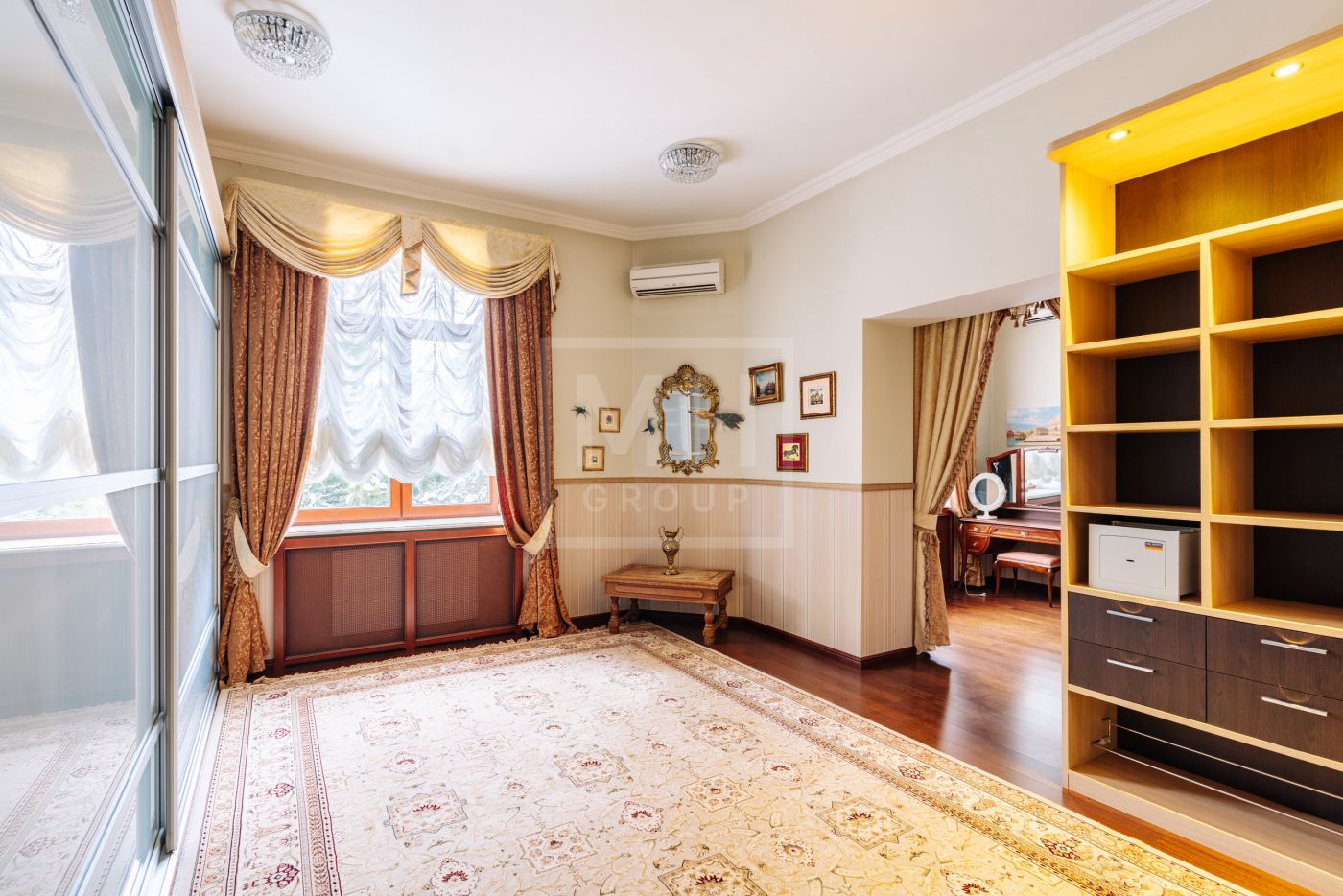 Резиденция на просторном участке с собственным озером. Отделка фасада выполнена из светло-бежевых оттенков штукатурки, что вместе с кровлей бордовых тонов керамической черепицы делают дом невероятно красивым. Ремонт выполнен в классическом стиле с применением дорогостоящих материалов. Высокие потолки в помещениях и второй свет в зоне гостиной наполняют дом светом и делают его очень просторным. Планировкой резиденции предусмотрены 3 спальни, 2 гостиные, кухня, 2 столовые, кабинет и SPA-зона с бассейном, хамамом и сауной. На просторном лесном участке кроме основного дома расположены гаража с квартирой для персонала, летний домик, беседка и зона барбекю.