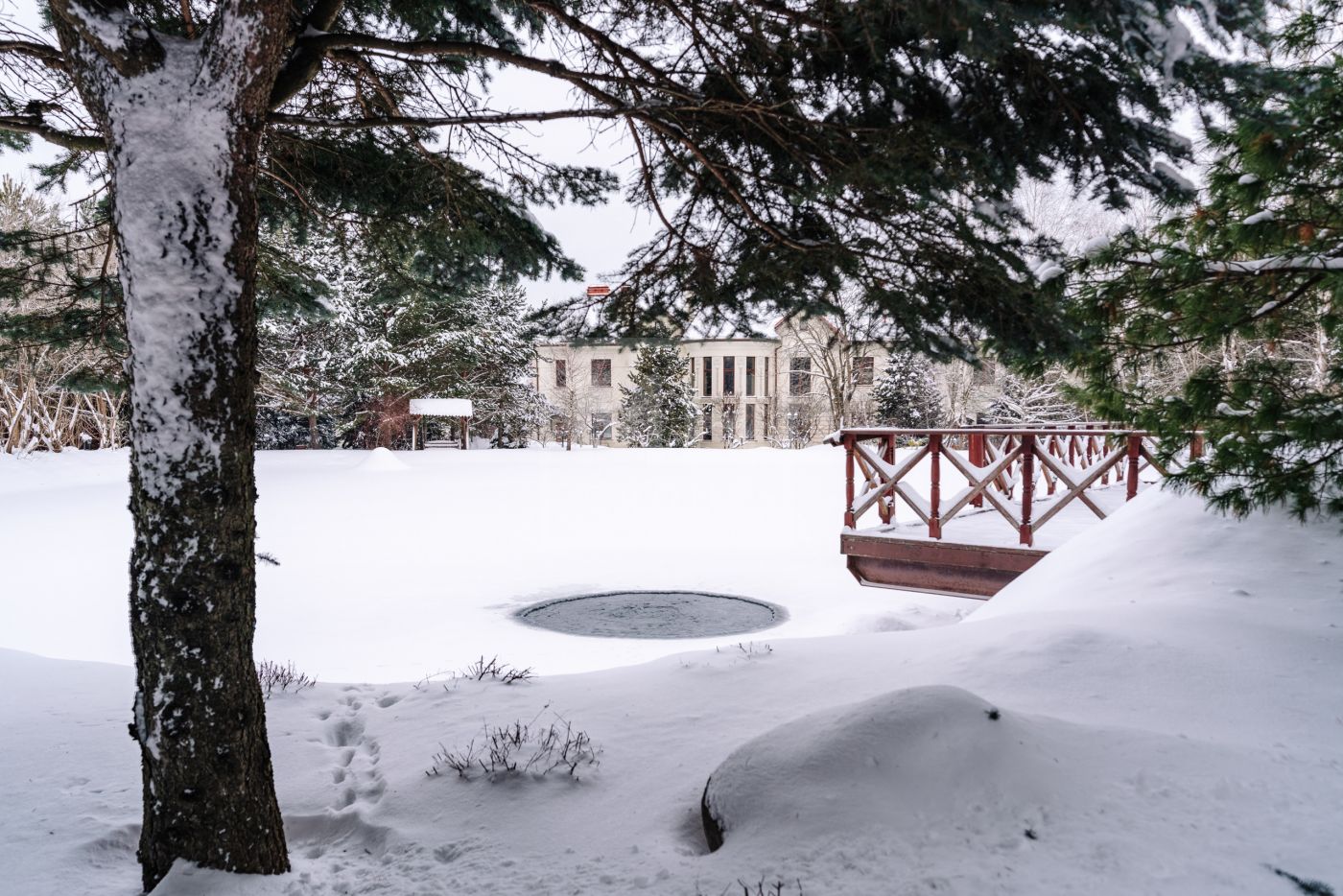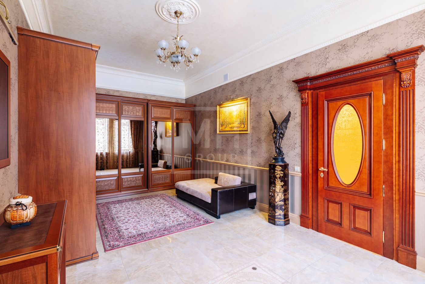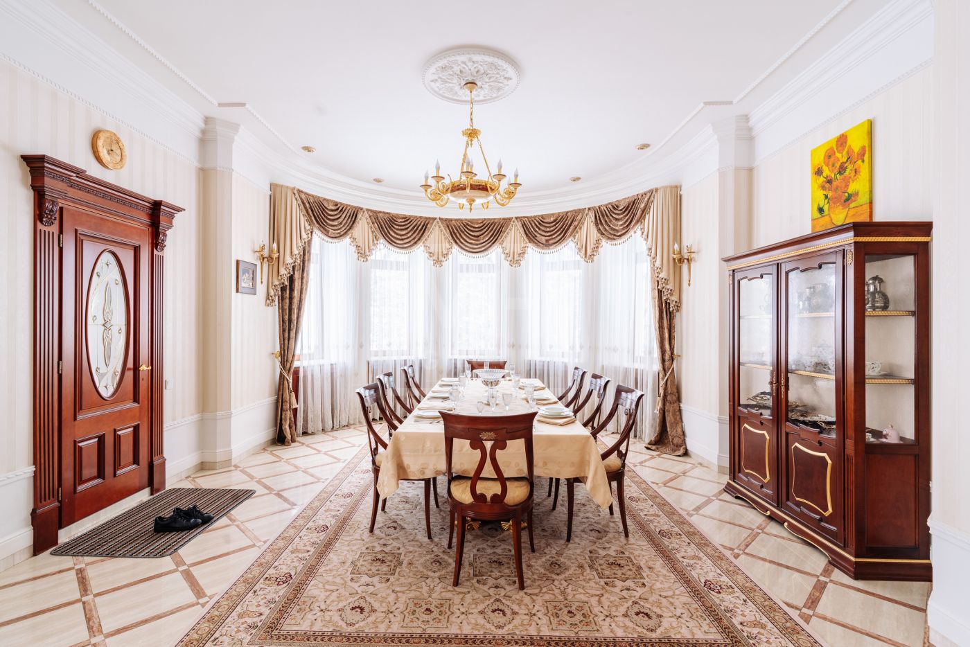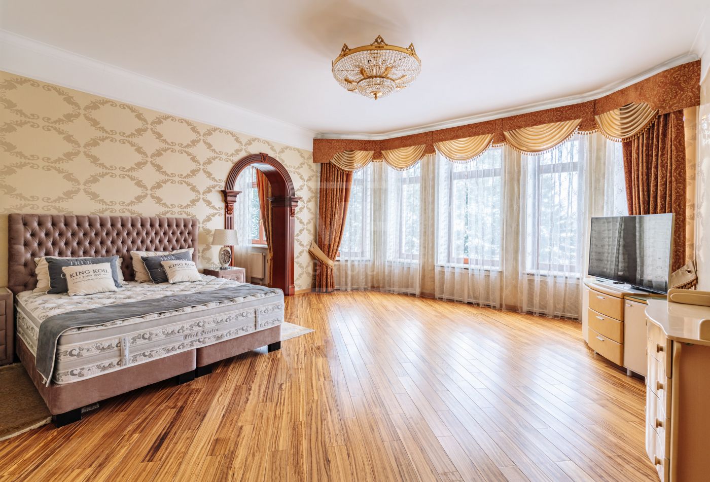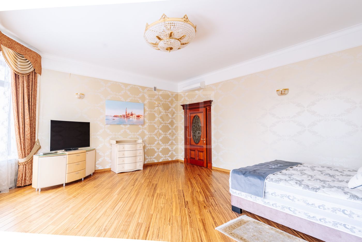 Резиденция на просторном участке с собственным озером. Отделка фасада выполнена из светло-бежевых оттенков штукатурки, что вместе с кровлей бордовых тонов керамической черепицы делают дом невероятно красивым. Ремонт выполнен в классическом стиле с применением дорогостоящих материалов. Высокие потолки в помещениях и второй свет в зоне гостиной наполняют дом светом и делают его очень просторным. Планировкой резиденции предусмотрены 3 спальни, 2 гостиные, кухня, 2 столовые, кабинет и SPA-зона с бассейном, хамамом и сауной. На просторном лесном участке кроме основного дома расположены гаража с квартирой для персонала, летний домик, беседка и зона барбекю.