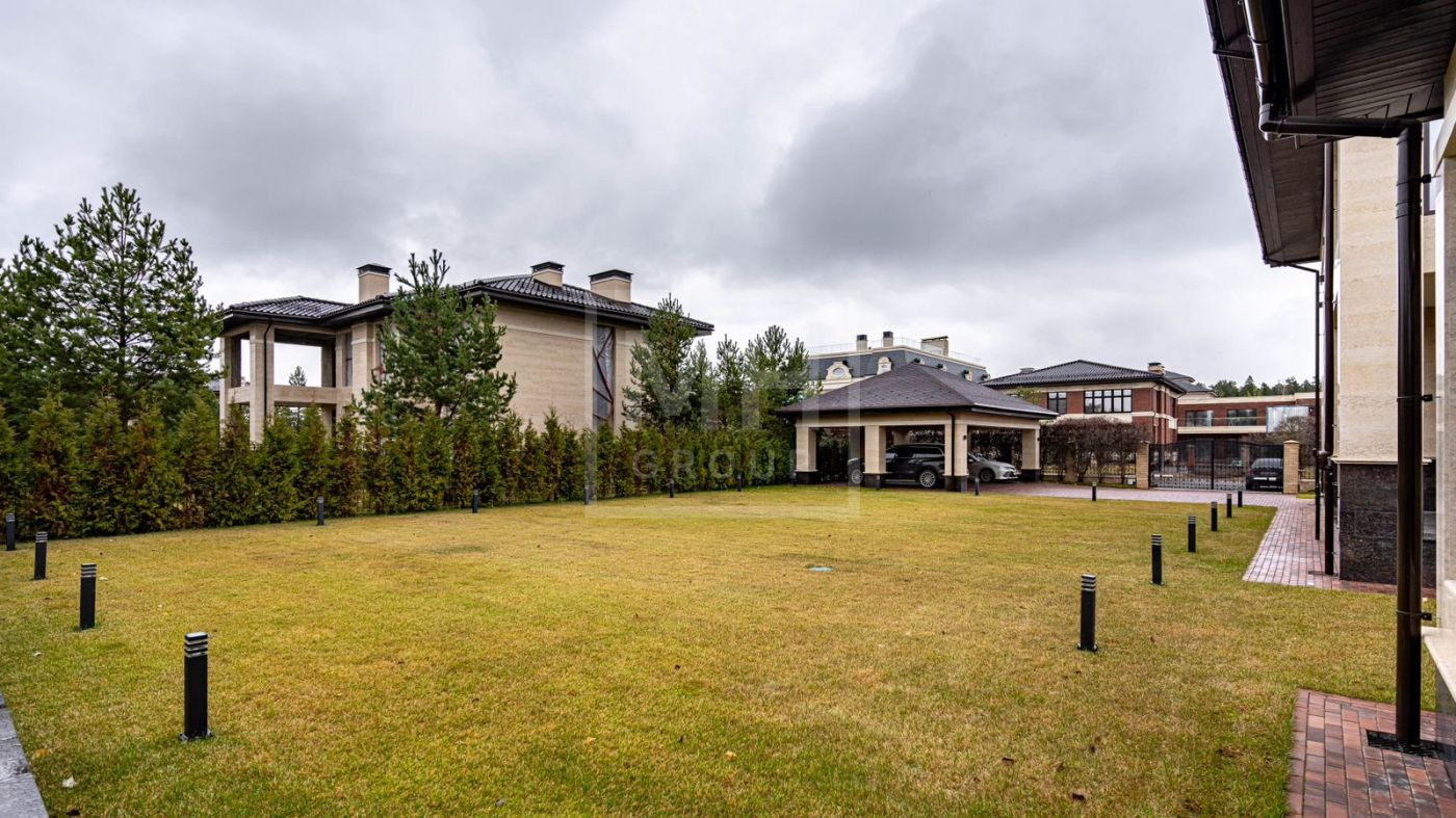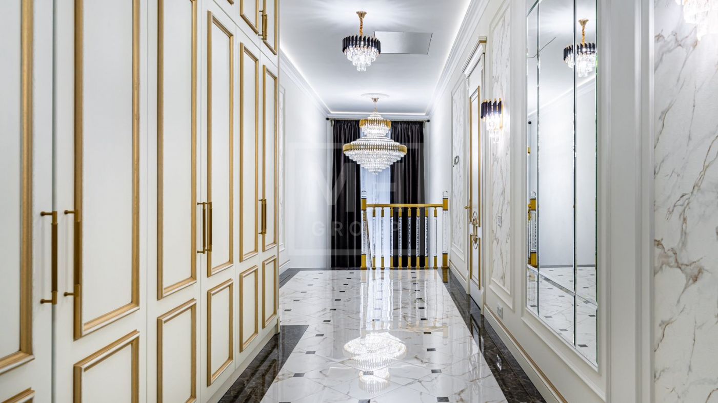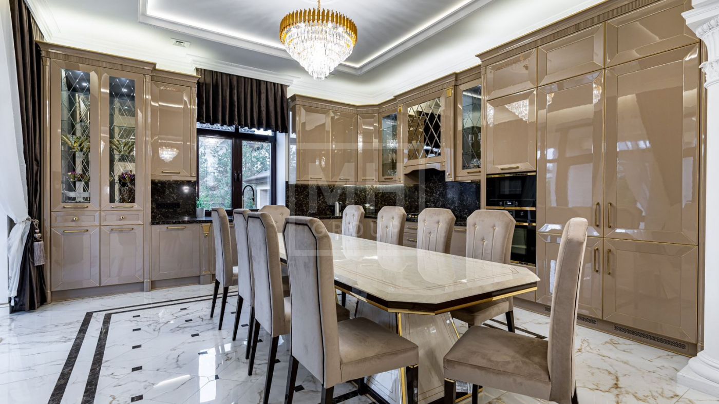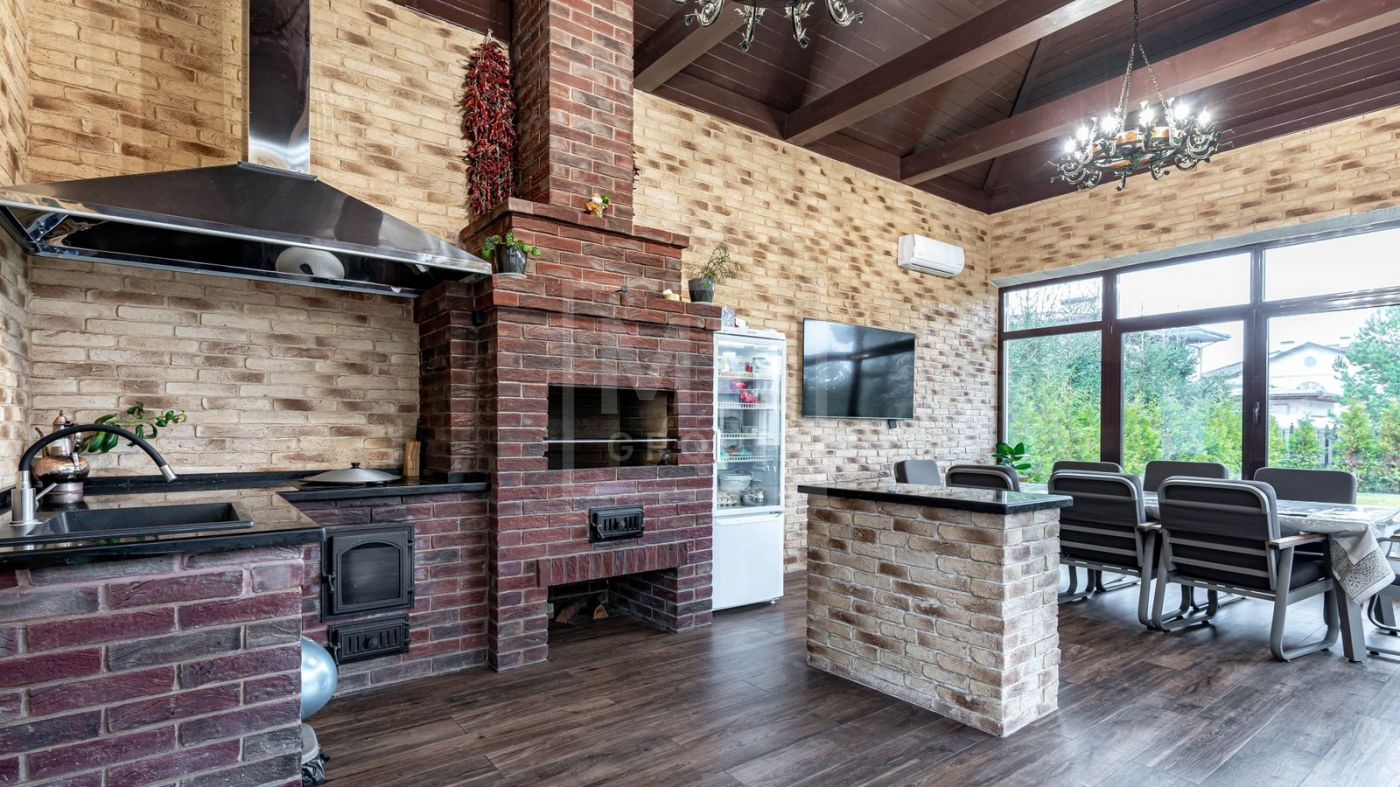К продаже представлен загородный дом с 6-ю спальнями, площадь которого составляет 400 м.², а площадь гостевого дома с кухней, гостиной и спальней - 120 м.². Функциональная планировка позволяет удобно разместиться большой семье и комфортно использовать внутреннее пространство. В доме выполнен превосходный дизайнерский ремонт с применением высококачественных материалов. Роскошный интерьер в классическом стиле исполнен в спокойных тонах, дополнен изысканной мебелью и бытовой техникой. Мебель для кухни и гостиной бренда "Diamante" привезена из Италии. Лестница выполнена из натурального камня. Уютная гостиная с мраморным камином и панорамными окнами, кухня-столовая с выходом на открытую террасу, станет любимым местом притяжения для душевных посиделок с близкими. На втором этаже располагаются: 4 спальни, две из которых с индивидуальными гардеробными и санузлами, спортзал. Фасад облицован натуральным камнем и ракушечным песчаником. Цоколь - индийским гранитом. На крыше уложена натуральная немецкая черепица. По периметру дома уложен итальянский гранит. Расслабиться и восстановить силы после трудового дня будет приятно в собственной дровяной бане и хаммаме. Беседка с уютной и комфортной баней, шикарным хаммамом с щадящим тепловым режимом и высокой влажностью имеет зону для готовки и барбекю.
