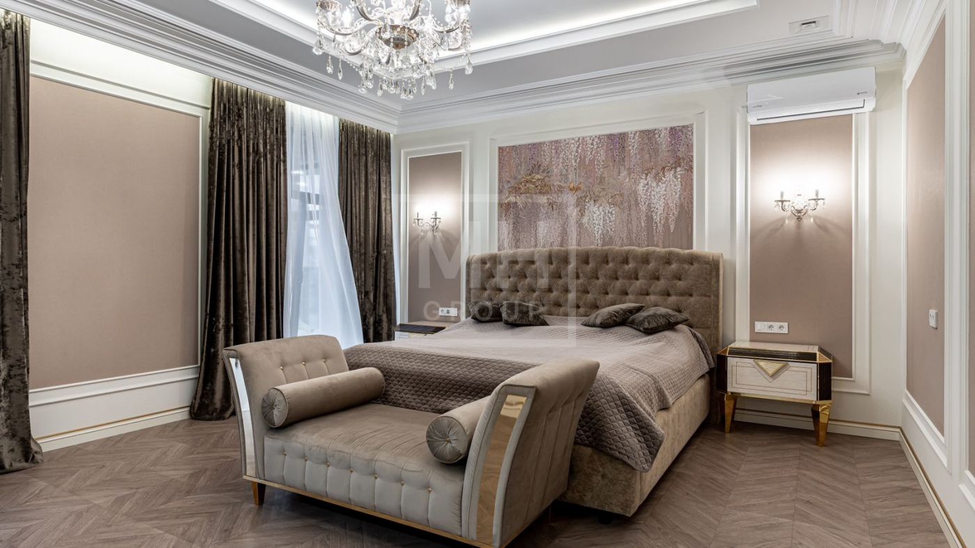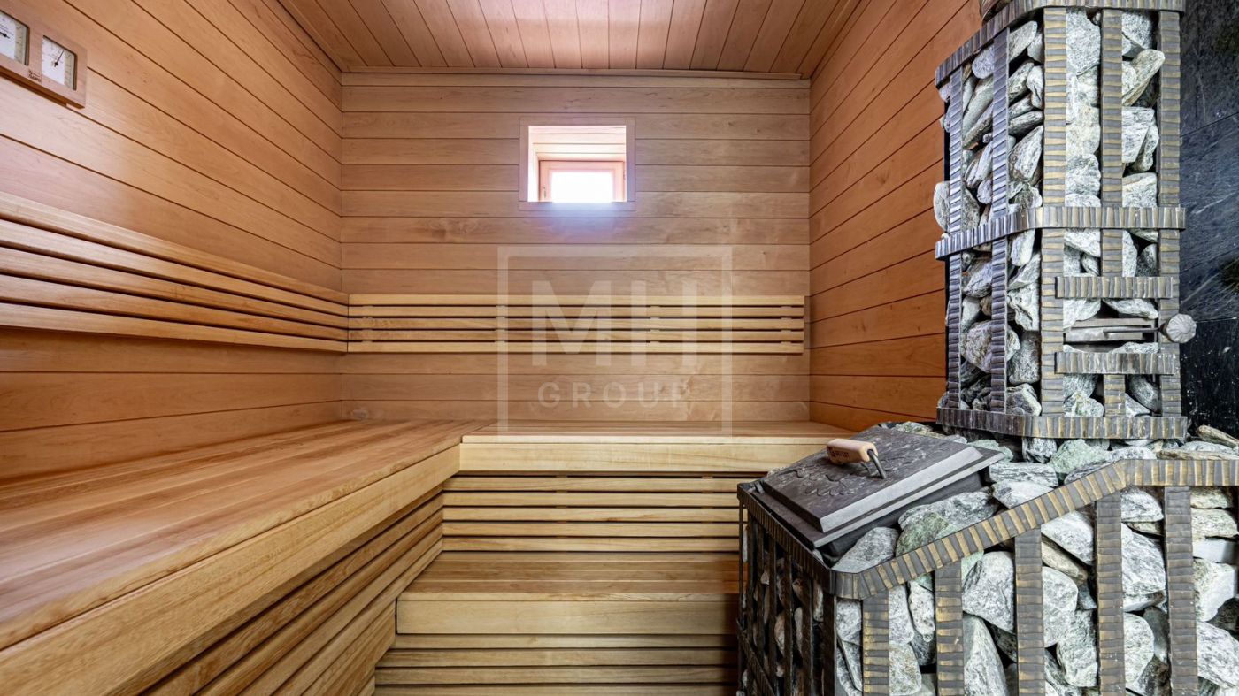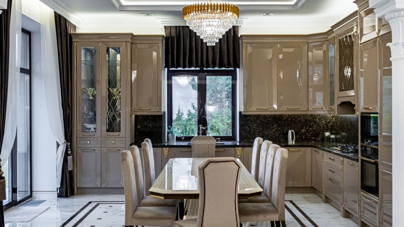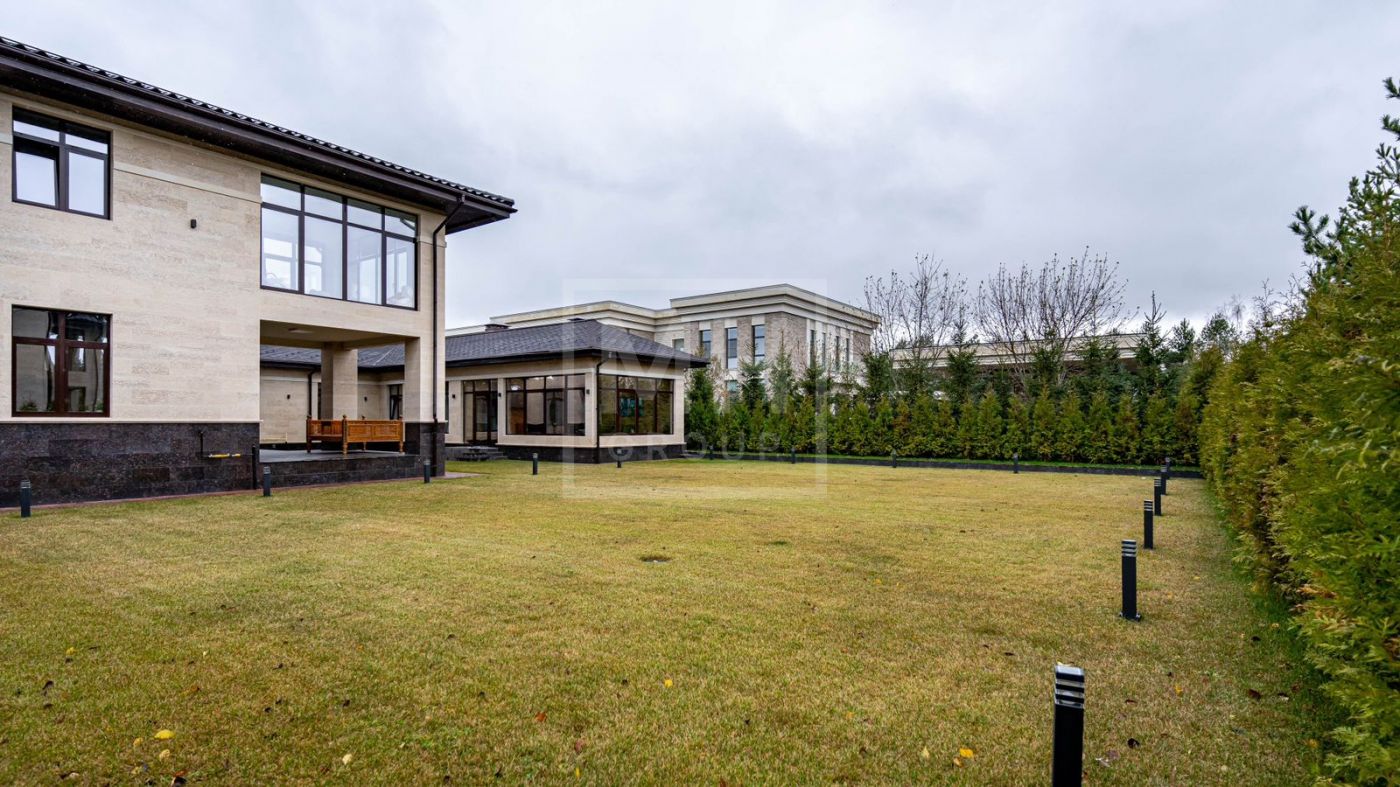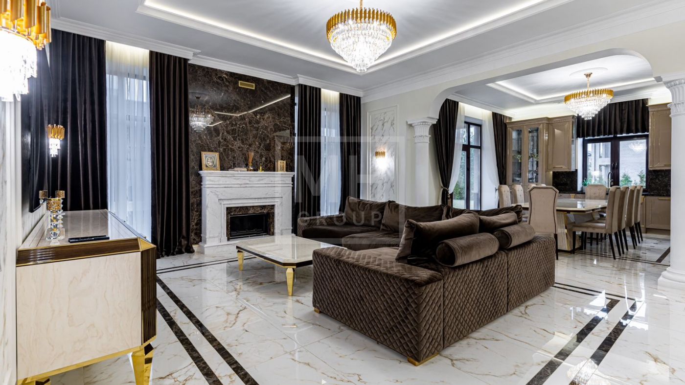 К продаже представлен загородный дом с 6-ю спальнями, площадь которого составляет 400 м.², а площадь гостевого дома с кухней, гостиной и спальней - 120 м.². Функциональная планировка позволяет удобно разместиться большой семье и комфортно использовать внутреннее пространство. В доме выполнен превосходный дизайнерский ремонт с применением высококачественных материалов. Роскошный интерьер в классическом стиле исполнен в спокойных тонах, дополнен изысканной мебелью и бытовой техникой. Мебель для кухни и гостиной бренда "Diamante" привезена из Италии. Лестница выполнена из натурального камня. Уютная гостиная с мраморным камином и панорамными окнами, кухня-столовая с выходом на открытую террасу, станет любимым местом притяжения для душевных посиделок с близкими. На втором этаже располагаются: 4 спальни, две из которых с индивидуальными гардеробными и санузлами, спортзал. Фасад облицован натуральным камнем и ракушечным песчаником. Цоколь - индийским гранитом. На крыше уложена натуральная немецкая черепица. По периметру дома уложен итальянский гранит. Расслабиться и восстановить силы после трудового дня будет приятно в собственной дровяной бане и хаммаме. Беседка с уютной и комфортной баней, шикарным хаммамом с щадящим тепловым режимом и высокой влажностью имеет зону для готовки и барбекю.