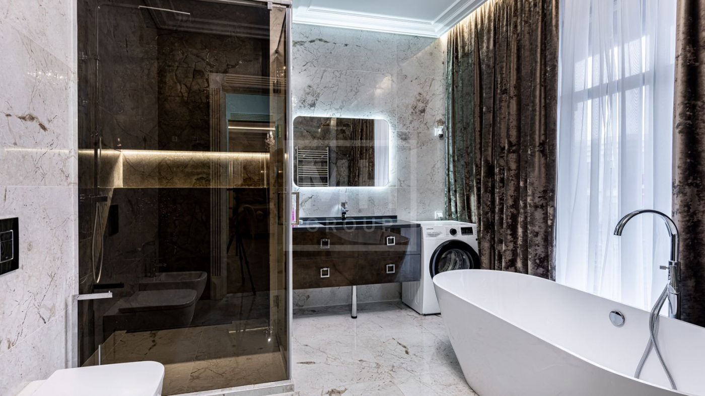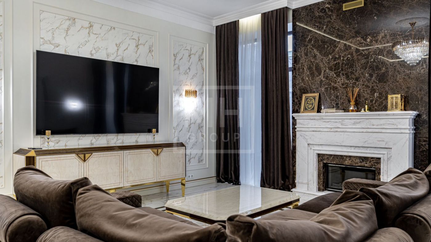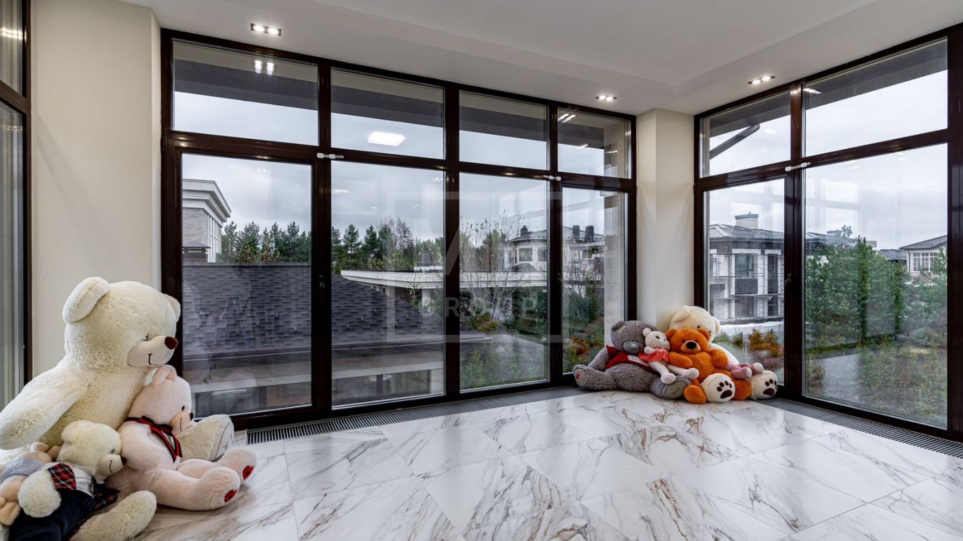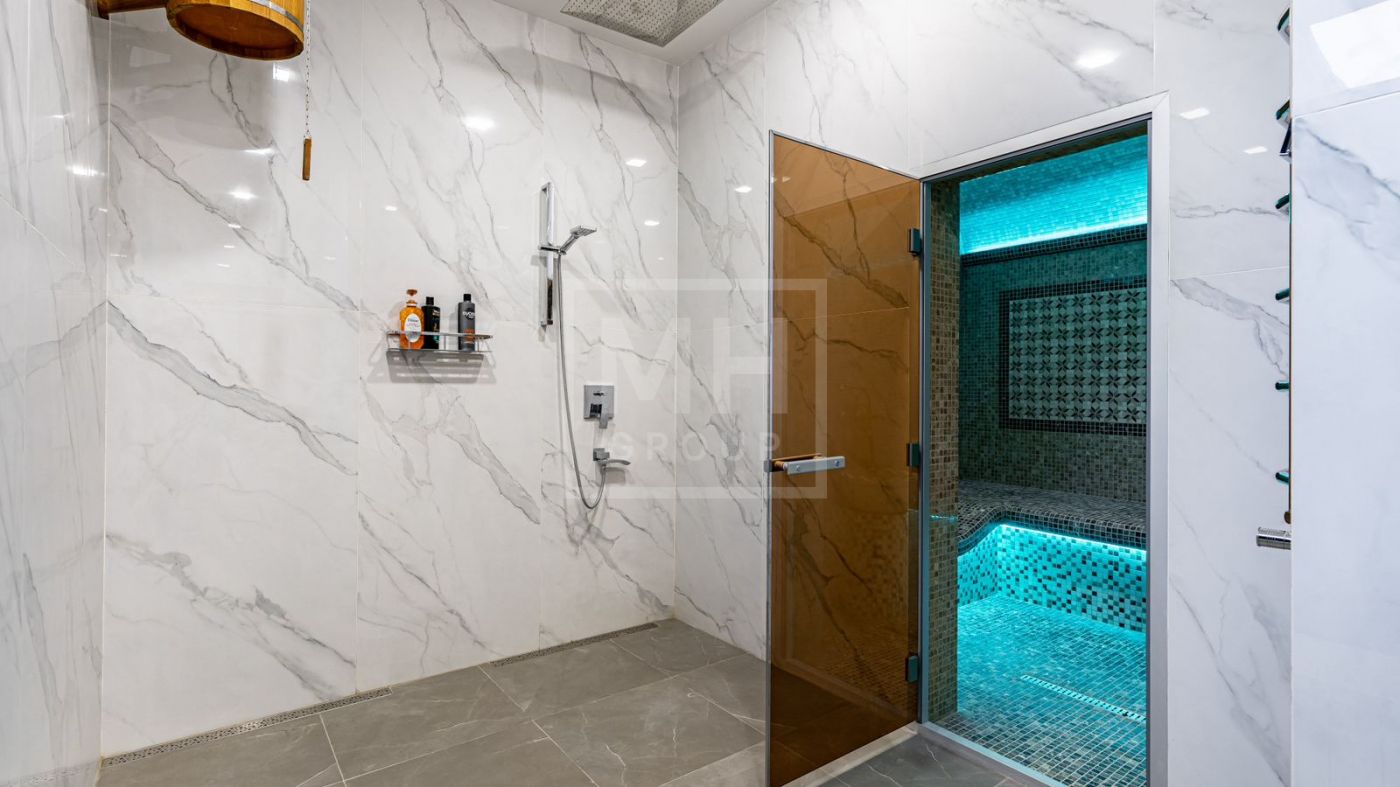 К продаже представлен загородный дом с 6-ю спальнями, площадь которого составляет 400 м.², а площадь гостевого дома с кухней, гостиной и спальней - 120 м.². Функциональная планировка позволяет удобно разместиться большой семье и комфортно использовать внутреннее пространство. В доме выполнен превосходный дизайнерский ремонт с применением высококачественных материалов. Роскошный интерьер в классическом стиле исполнен в спокойных тонах, дополнен изысканной мебелью и бытовой техникой. Мебель для кухни и гостиной бренда "Diamante" привезена из Италии. Лестница выполнена из натурального камня. Уютная гостиная с мраморным камином и панорамными окнами, кухня-столовая с выходом на открытую террасу, станет любимым местом притяжения для душевных посиделок с близкими. На втором этаже располагаются: 4 спальни, две из которых с индивидуальными гардеробными и санузлами, спортзал. Фасад облицован натуральным камнем и ракушечным песчаником. Цоколь - индийским гранитом. На крыше уложена натуральная немецкая черепица. По периметру дома уложен итальянский гранит. Расслабиться и восстановить силы после трудового дня будет приятно в собственной дровяной бане и хаммаме. Беседка с уютной и комфортной баней, шикарным хаммамом с щадящим тепловым режимом и высокой влажностью имеет зону для готовки и барбекю.