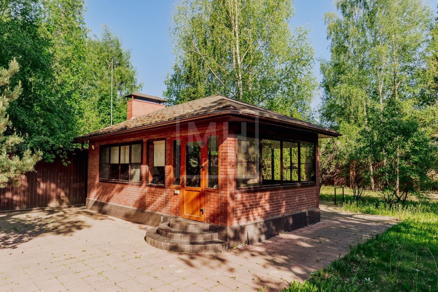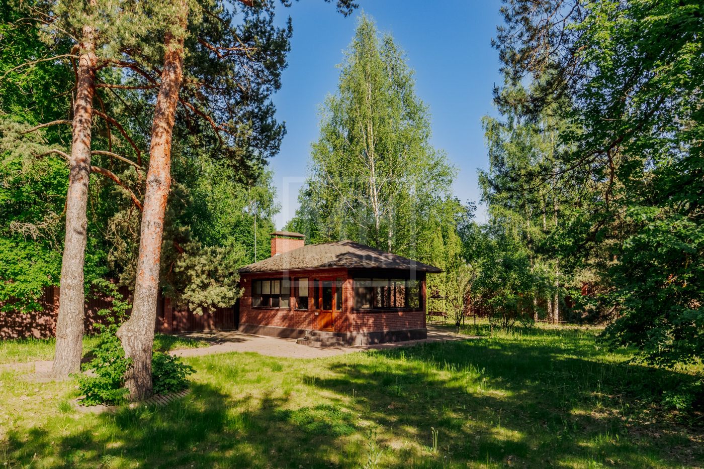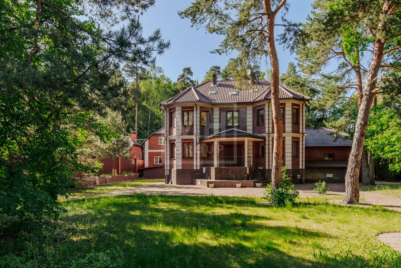Дом в современном стиле в лесной части охраняемого поселка Грибово.На участке только вековые сосны. Высажен газон. Участок ровной квадратной формы.