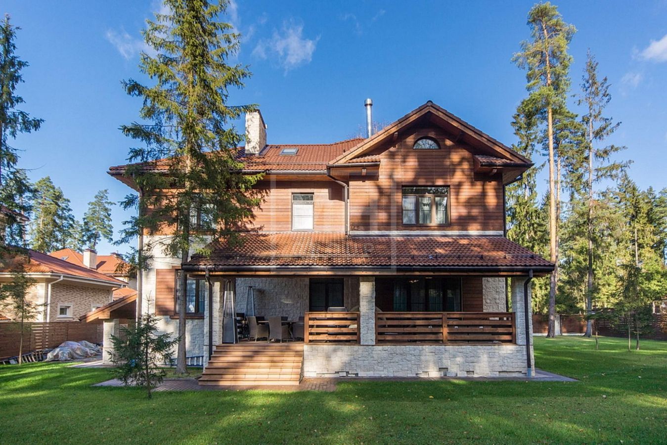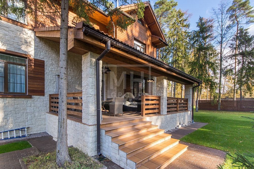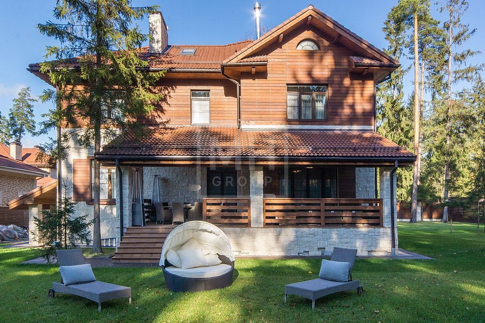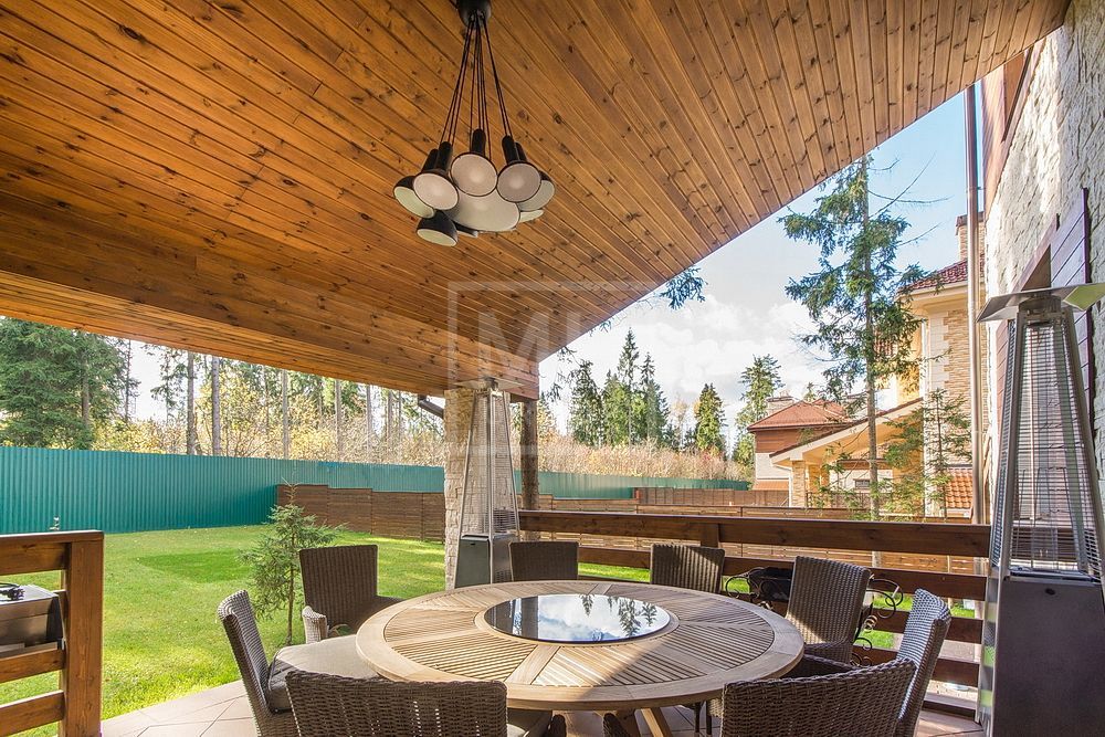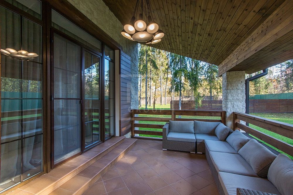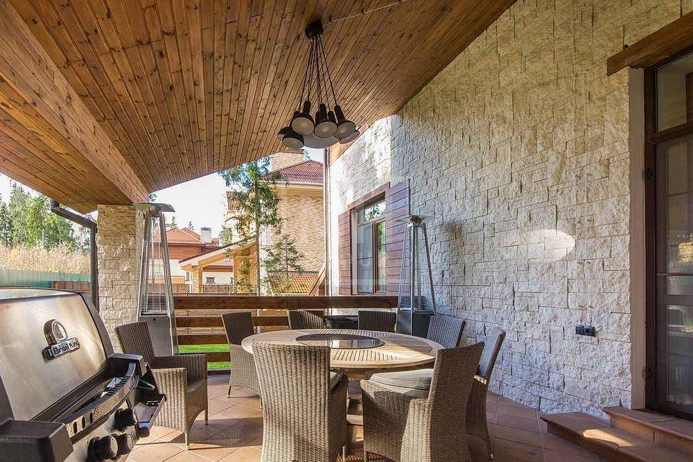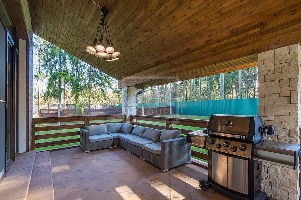 Просторный дом для большой семьи с гостиной с камином и 5 спальнями на лесном участке с соснами и елями. На веранде обустроена зона барбекю.