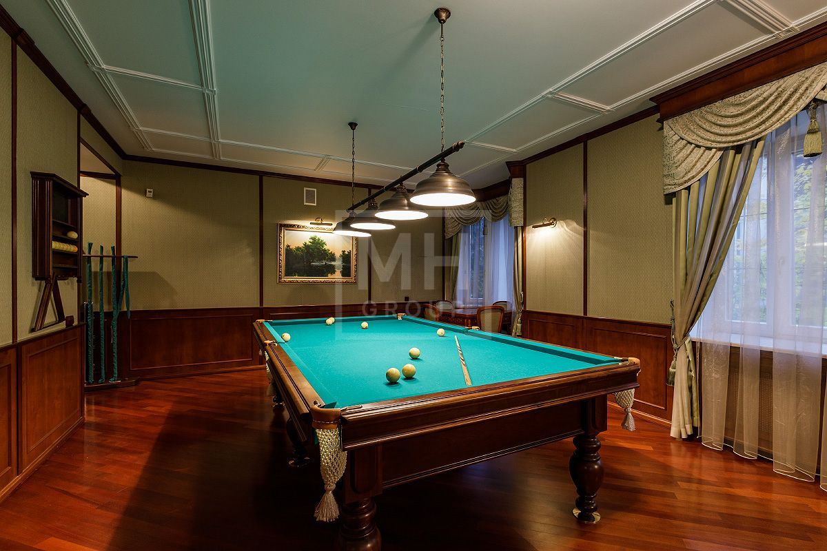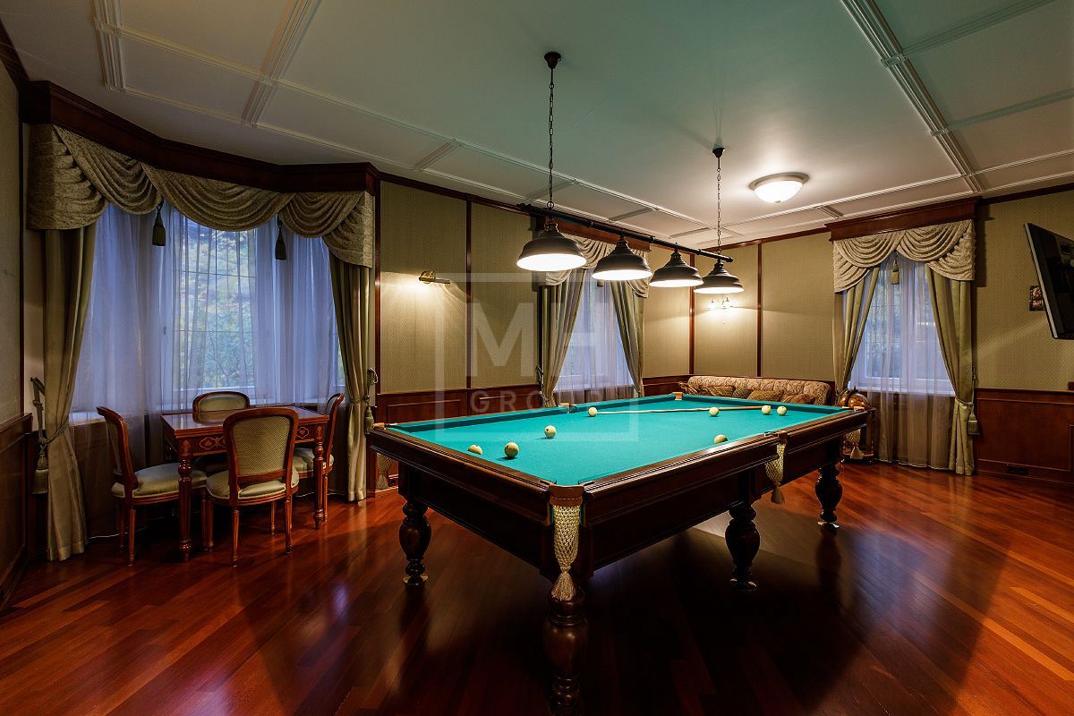 Этаж 1: холл, кабинет, гостевая спальная с ванной комнатой, бильярдная, гостинная с камином и зимним садом, гостевой с/у, кухня-столовая с комнатой для хранения кухонных принадлежностей.