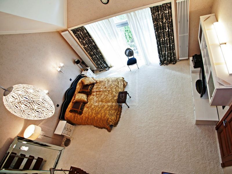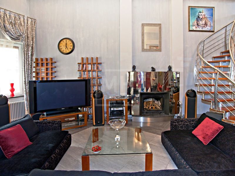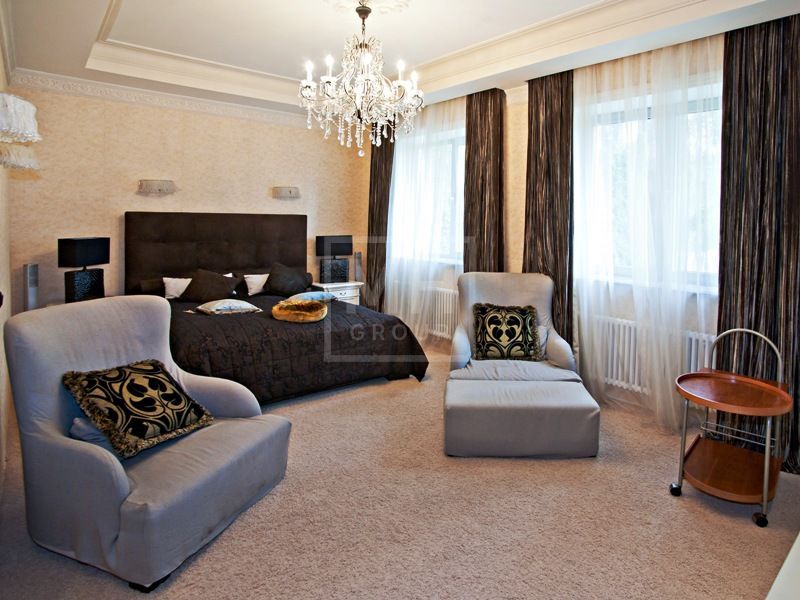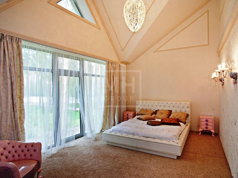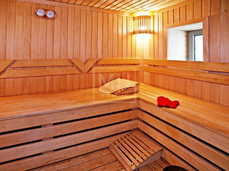 Этаж 1: холл, гостевой с/у, гостиная с камином, кухня-столовая, кабинет, 2 спальни, 2 ванные комнаты, 2 гардеробные, бассейн, сауна, душ, комната отдыха, гараж на 2 машины