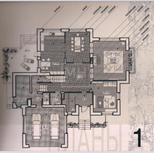Этаж 1: гараж на 2 м/м, кухня, столовая, веранда, гостиная,кабинет, гардеробная, с/у, кладовая, котельная
