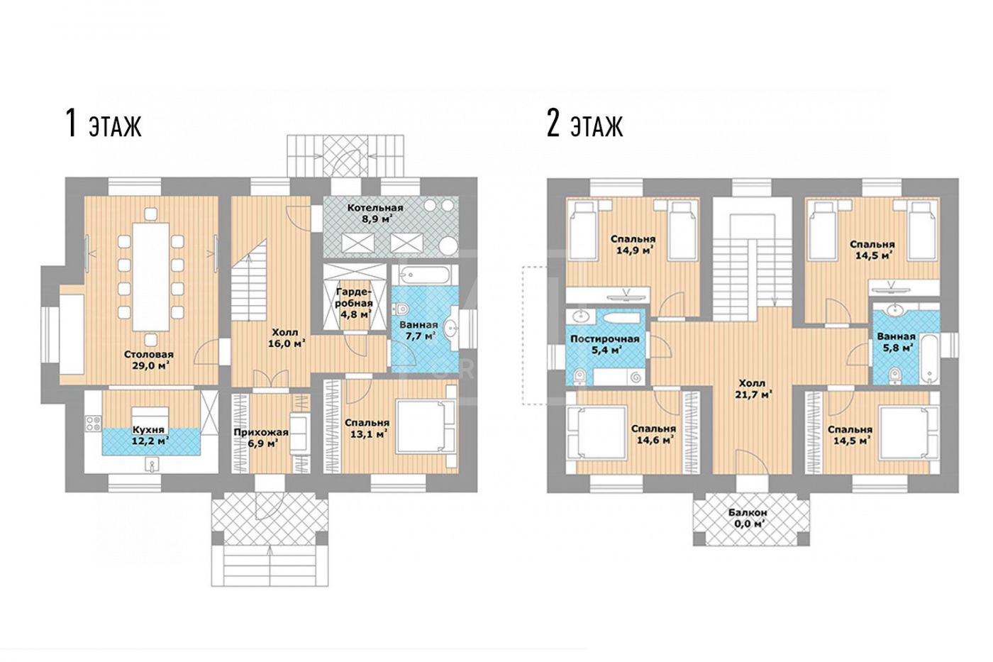 Этаж 2: холл, 4 спальни, с/у, постирочная, ванная, балкон.