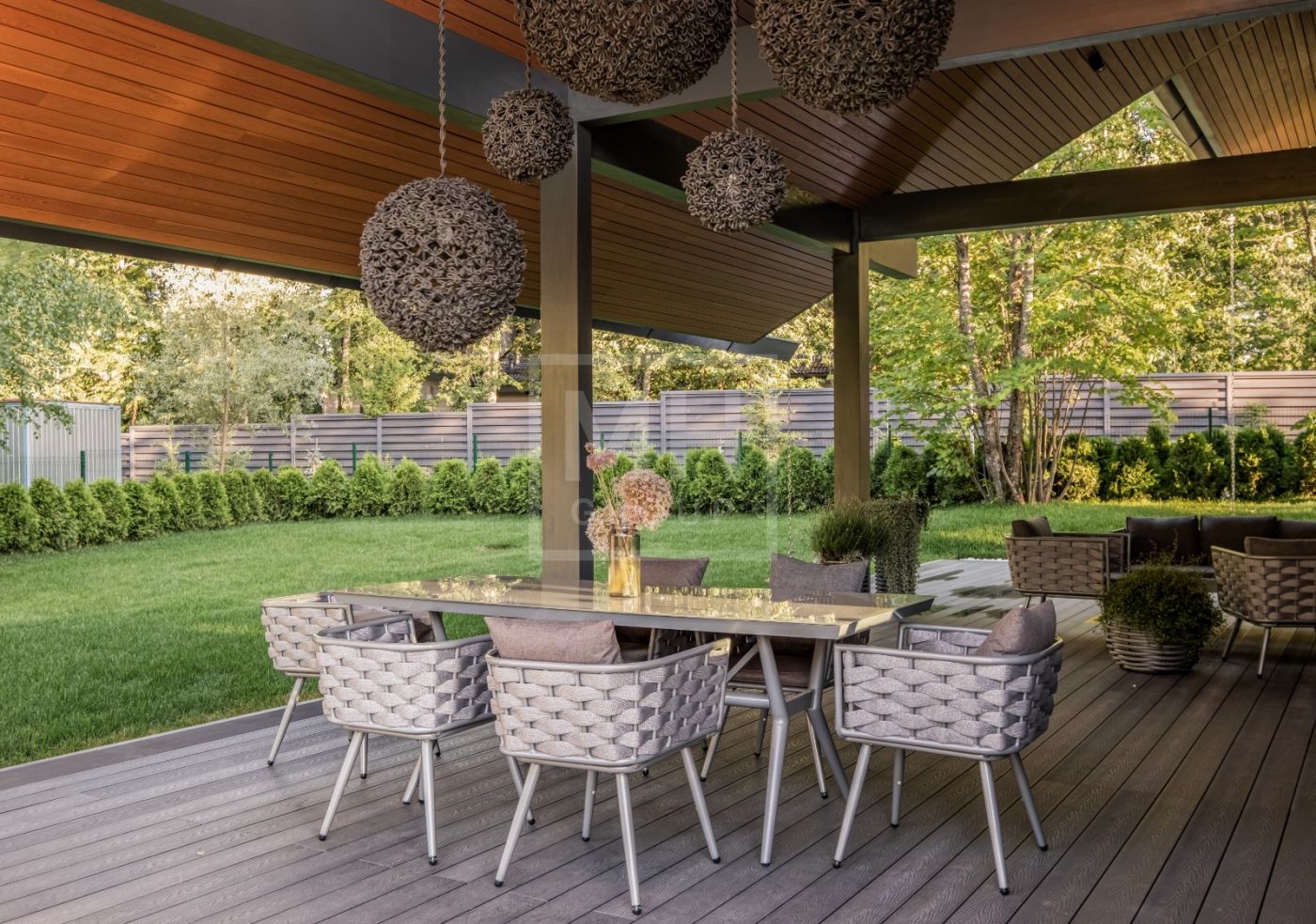 На участке выполнены ландшафтные работы: дорожки, освещение, дополнительно высажены хвойные крупномеры и живая изгородь из туй.