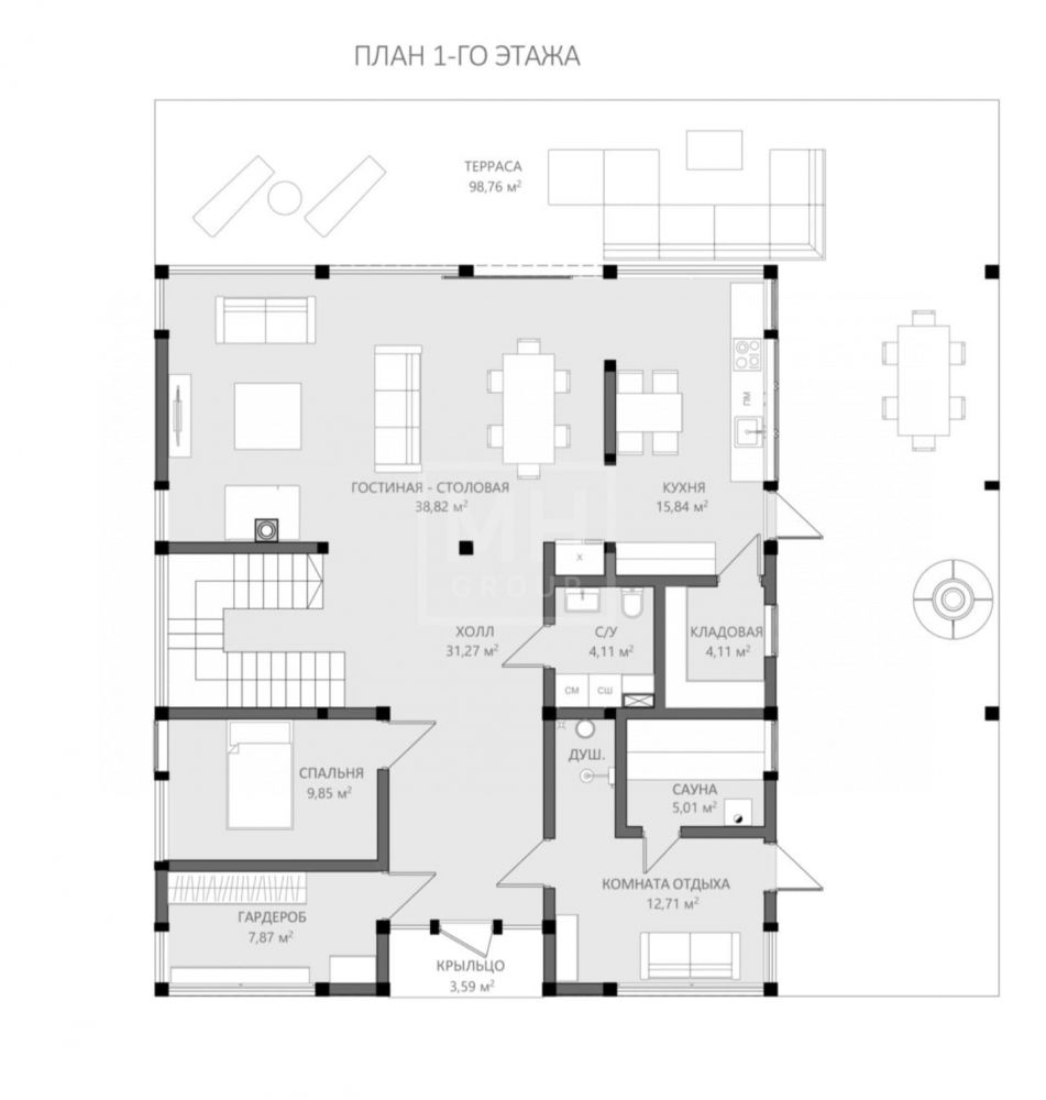 Этаж 1: Крыльцо, холл, гардеробная, спальня, с/у, кухня, кладовая, гостиная-столовая со вторым светом, комната отдыха, сауна, душевая, терраса.