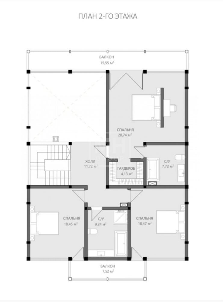 Этаж 2: Мастер-спальня с гардеробной и с/у и балконом, холл, 2 спальни с с/у и балконом.