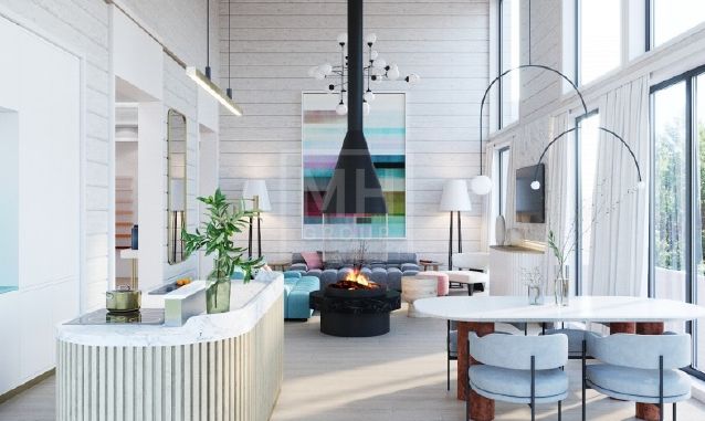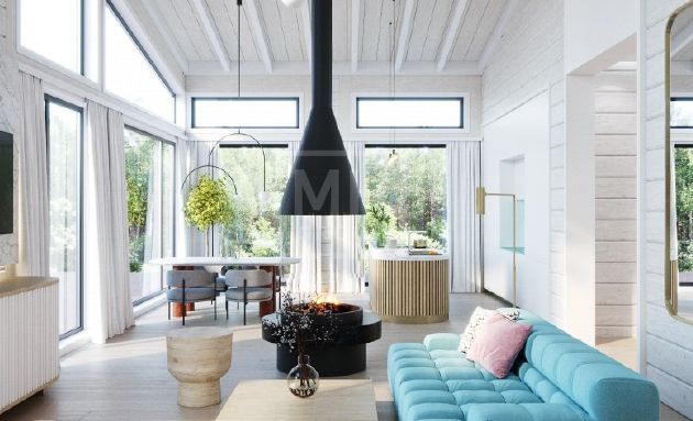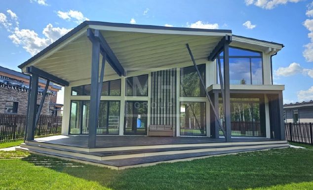 Стильный новый фахверк на прилесном участке в самой тихой части поселка. Благодаря высоким потолкам в помещениях и панорамному остеклению дом наполнен светом. В качестве подарка предлагается дизайн проект с мебелировкой всех помещений.