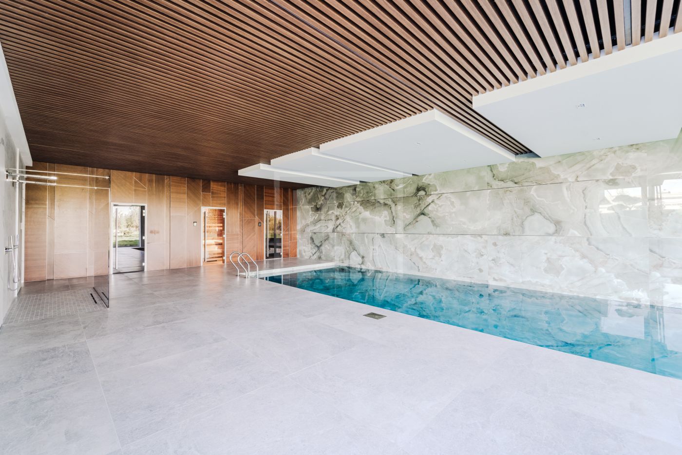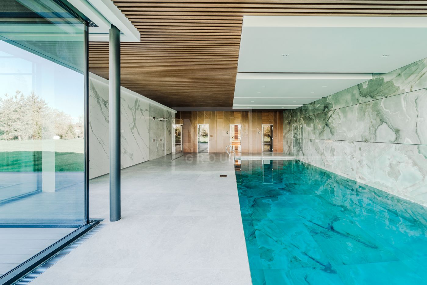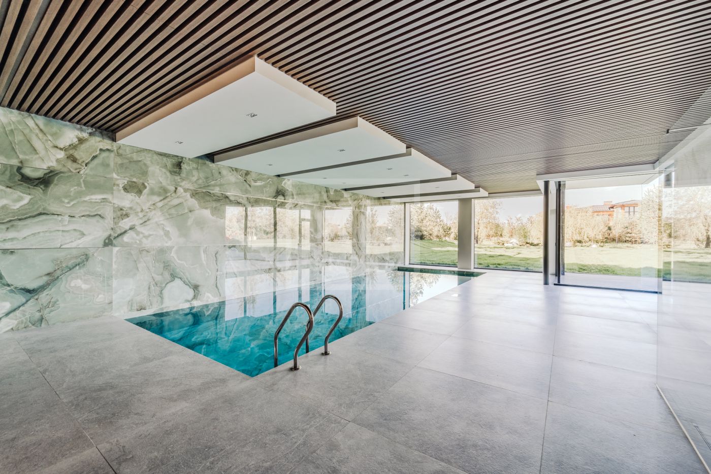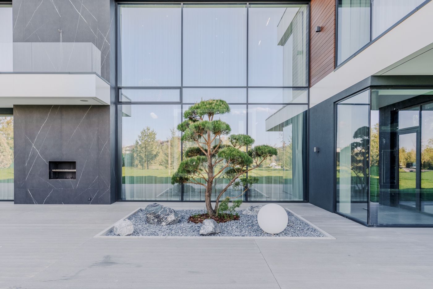 Этаж 1: Прихожая, гардеробная, кухня-столовая, гостиная со вторым светом, камином и выходом на террасу; санузел, бойлерная, постирочная, блок для персонала с кухней и санузлом, гараж для 3-х автомобилей. СПА-зона: сауна, хаммам, бассейн, санузел, раздевалка, душевая.