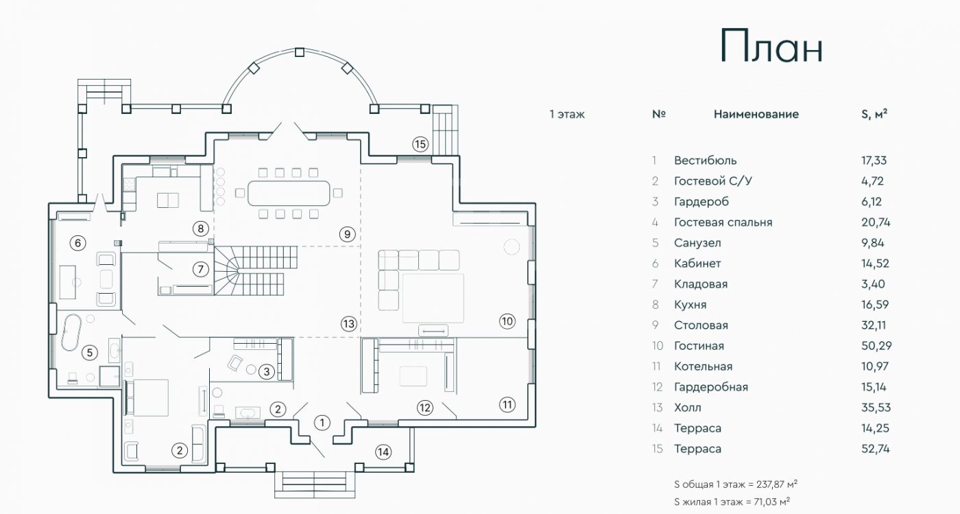 Этаж 1: Прихожая, гардеробная, кухня, столовая, гостиная, спальня с гардеробной, с/у, кабинет, кладовая, котельная
