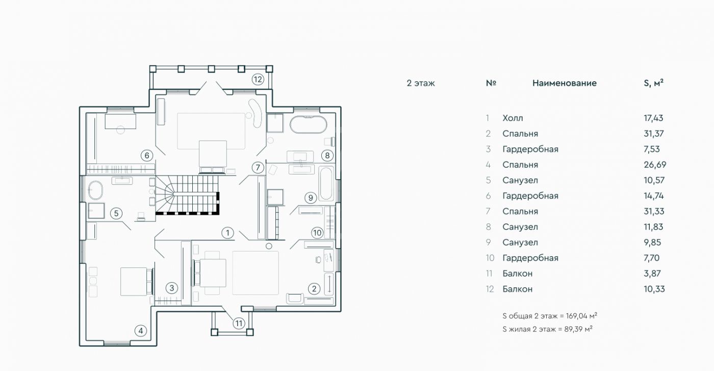 Этаж 2: Мастер-спальня с с/у и гардеробной, 2 спальни с с/у и гардеробными