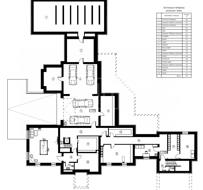Цоколь: Помещения свободного назначения (кинотеатр, спортзал, бильярдная, винотека), постирочная, 2 с/у, комната охраны, гараж