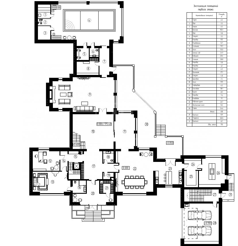 Этаж 1: Прихожая, гардеробная, с/у, рабочая кухня, кладовая, кухня, столовая, гостиная с камином, спальня, кабинет, спа-зона (бассейн, сауна, хаммам), 2 с/у, гараж