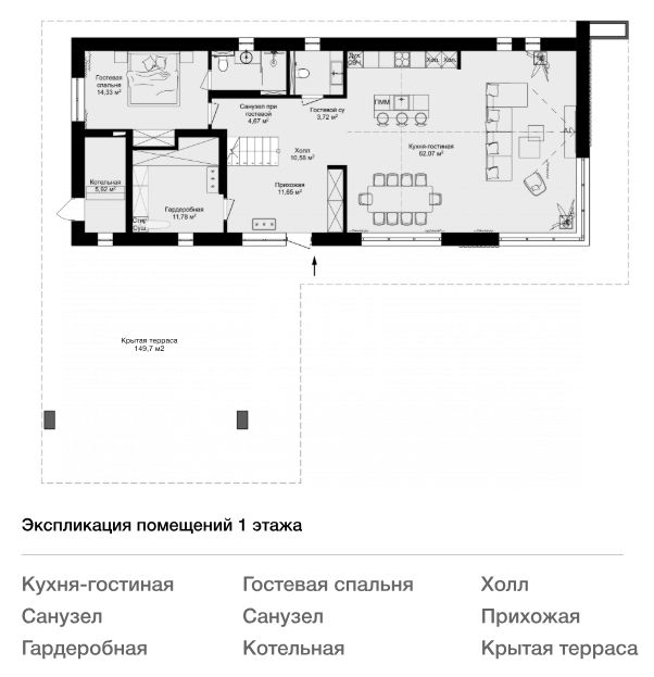 Этаж 1: Прихожая, гардеробная, кухня-гостиная , гостевая спальня с санузлом, котельная, холл, санузел, крытая терраса.