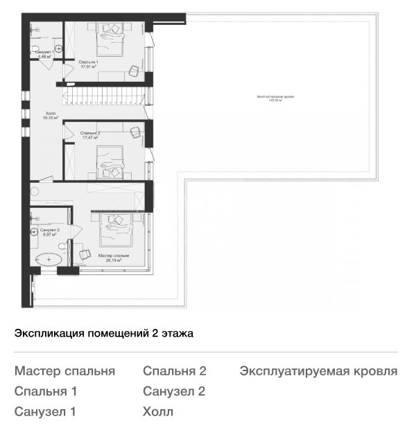 Этаж 2: Две мастер-спальни (возможно обустройство третьей спальни), холл, эксплуатируемая кровля.(терраса)