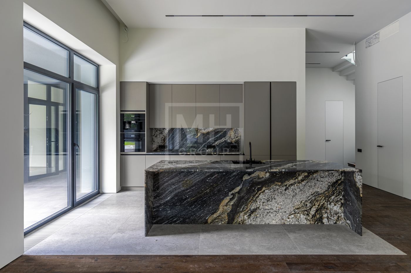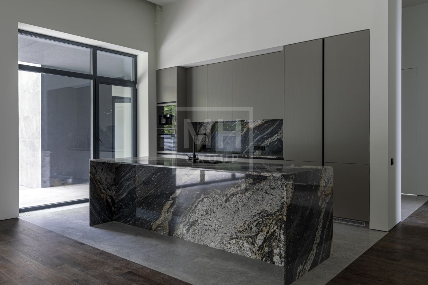 Дом частично меблирован ( кухня укомплектована техникой Miele, в отделке использованы слэбы из мрамора и гранита, полы - инженерная доска дуб , установлена приточно- вытяжная вентиляция и видеонаблюдение ).